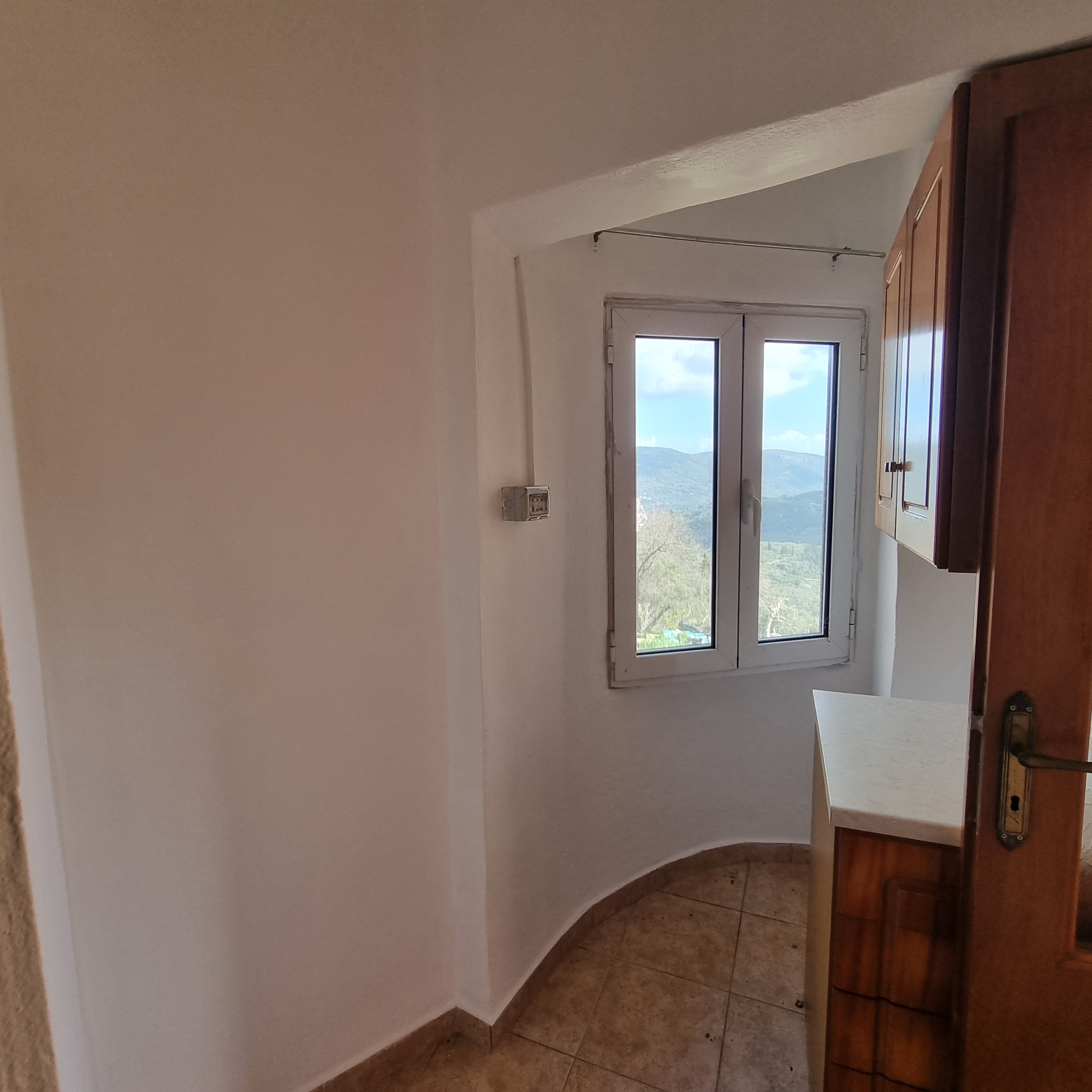 The staircase leads downstairs to another room which can either be a living room or a bedroom with an open fireplace and a shower room. There are plenty of windows making the house light and fresh and offering lovely views of the mountains at the back of the house.