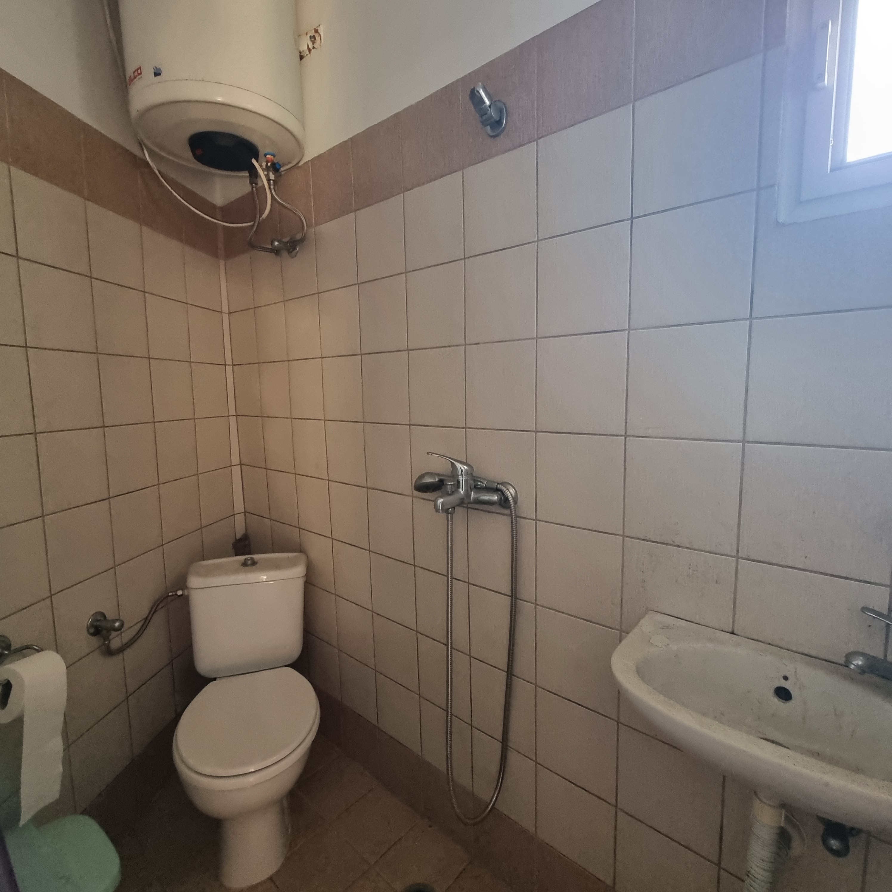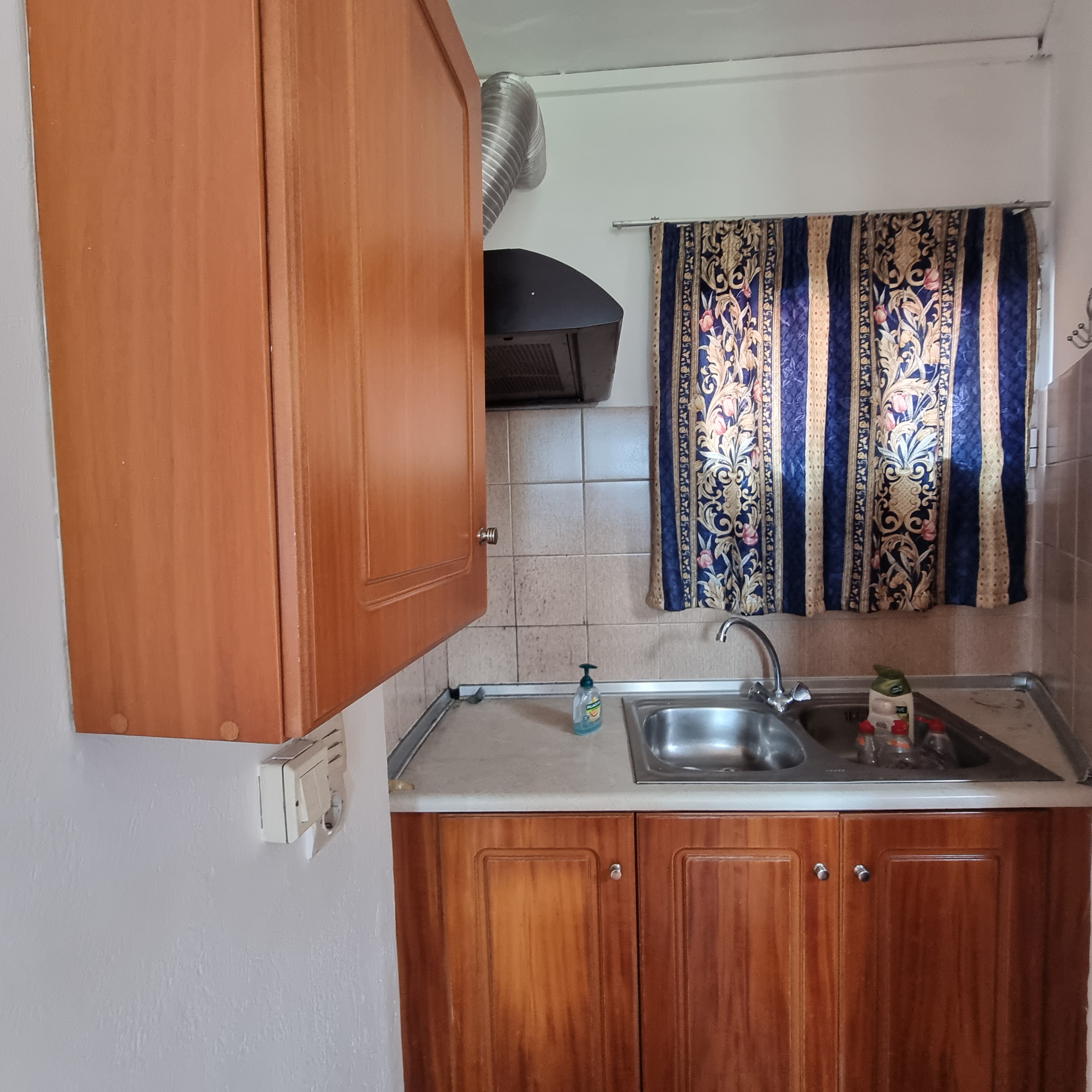 The front door leads to a room that can be used as a bedroom or living room. On this floor, there is also a hall, a kitchen, and a bathroom.