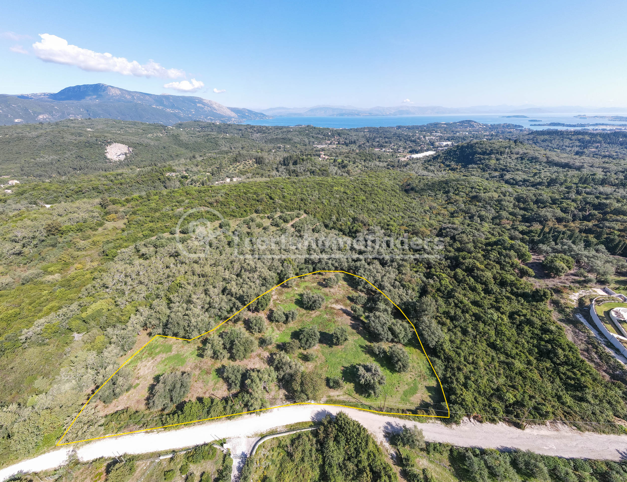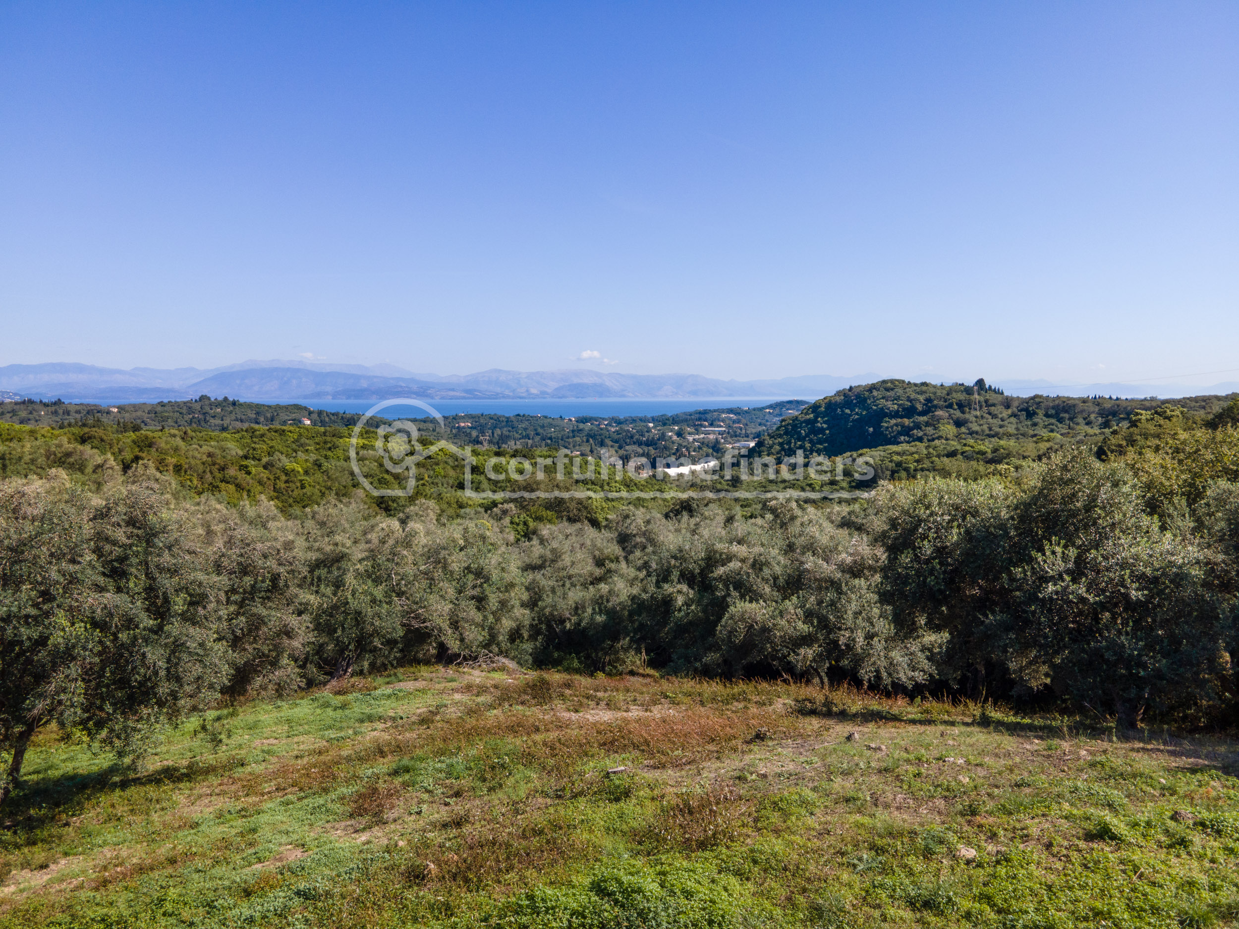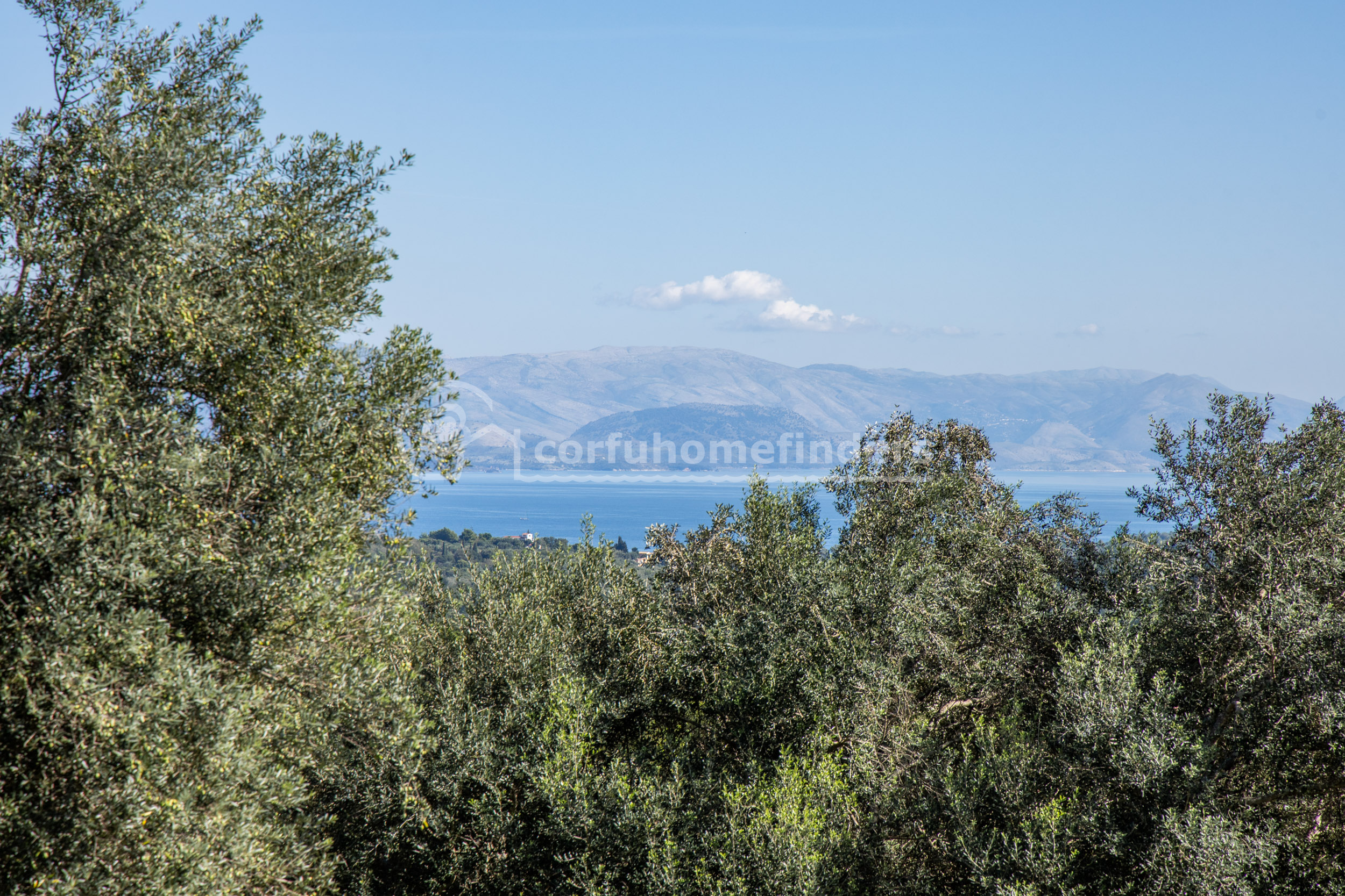 The land is covered in olive trees and other mature trees, and has a gentle slope at the top, dropping away in the front. There is water and electricity nearby, and the main road into Corfu town or the north of the island is a very short drive away, so the location is quite convenient.