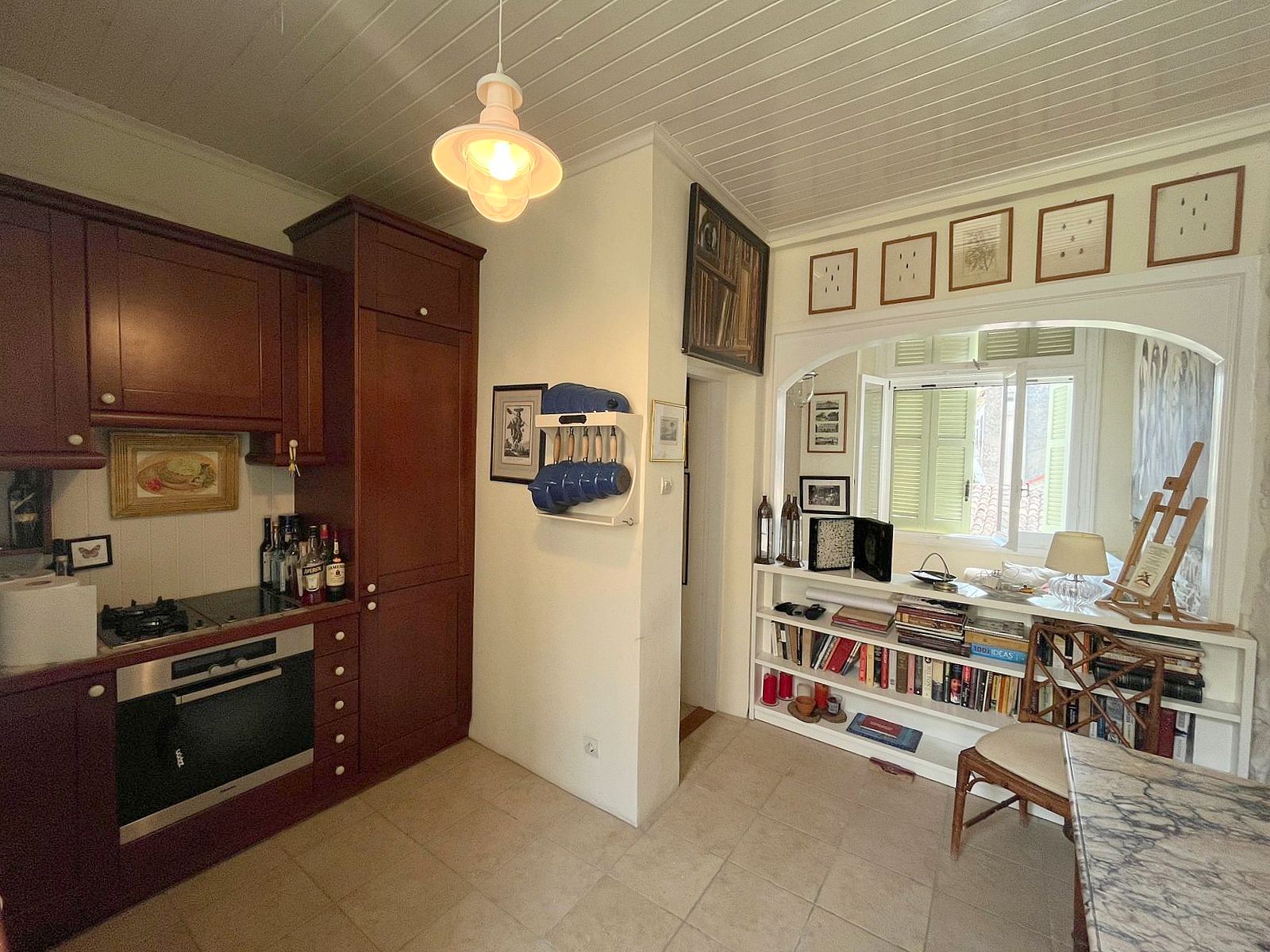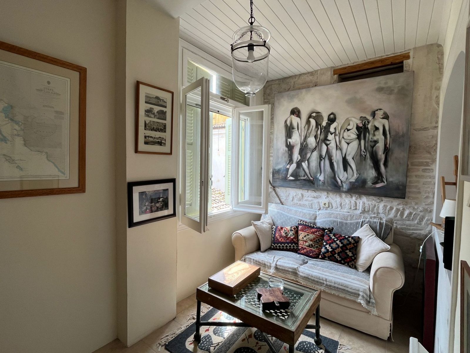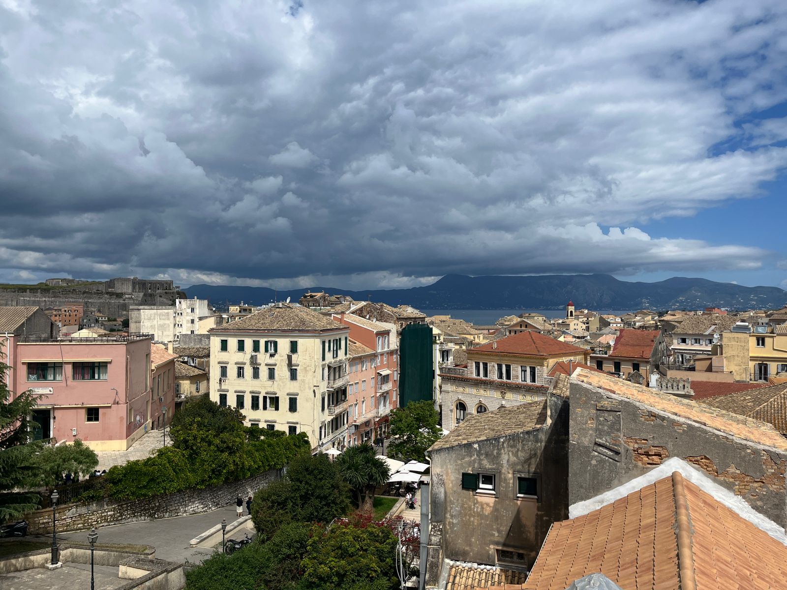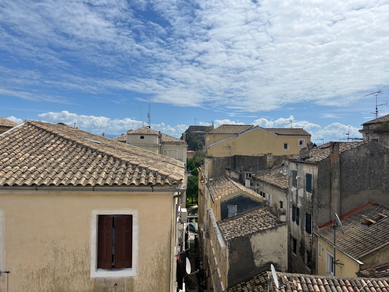 The kitchen has a door outside, with steps leading up to the magnificent roof terrace. The views from here are stunning, looking out over all of the old rooftops towards the sea and mount Pantokrator in the distance. Both the new and old fortresses are within sight, as is the imposing bell tower of St Spyridon church.