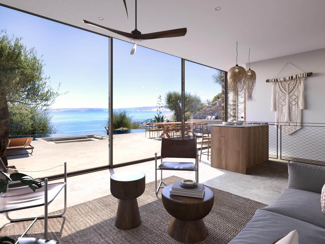 The Ormos project includes 10 off plan villas (nature houses) of which 2 remain available for sale. These villas are 130 m2 with 2 master suites + living room. All villas have spacious outdoor areas and private pool of 50 m2.