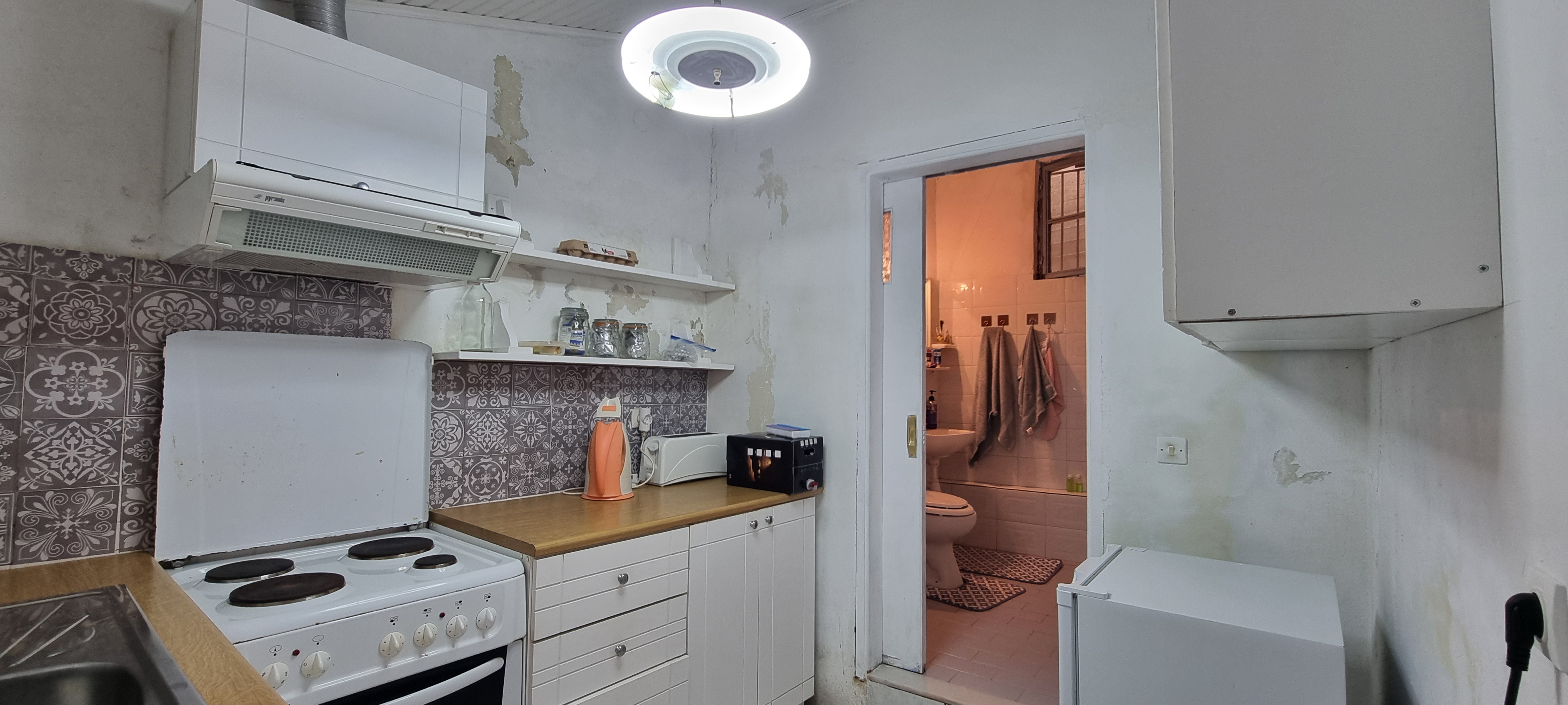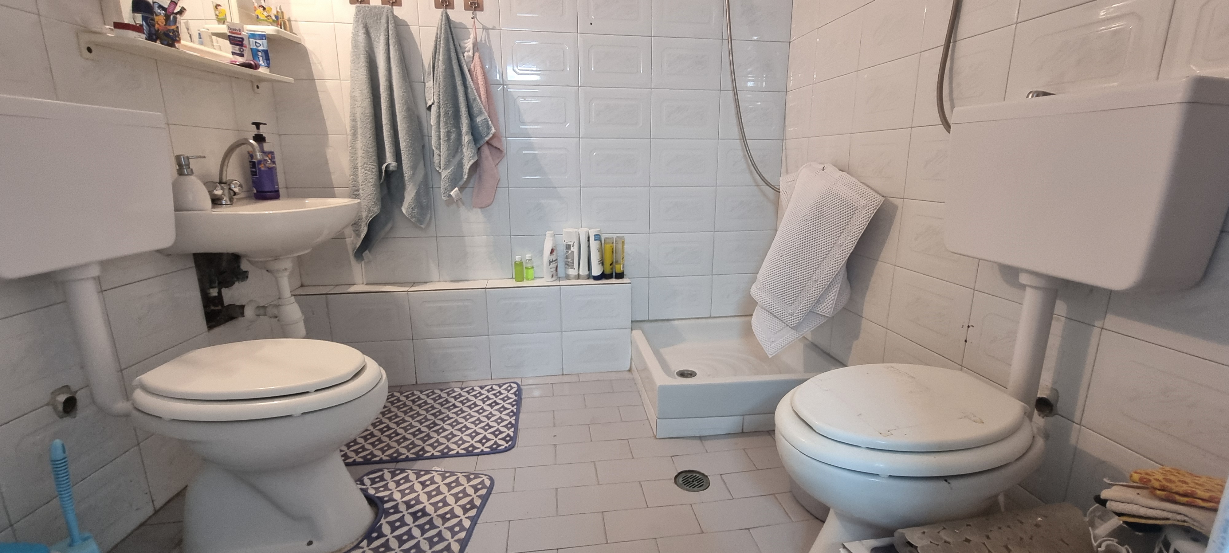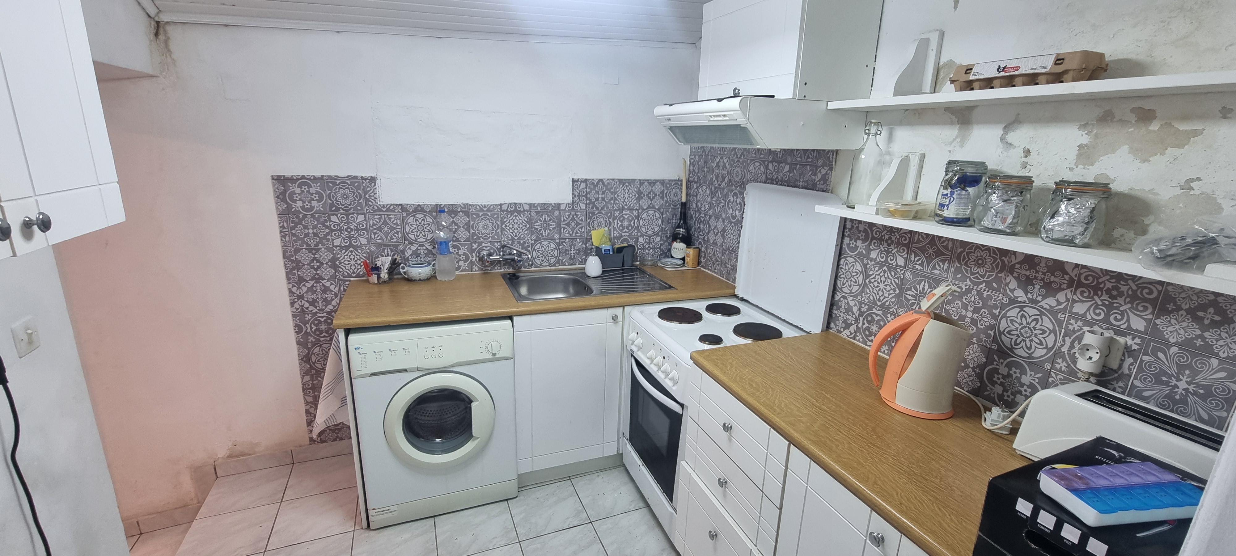 To the left, the kitchen is a decent size and fully equipped, also with a washing machine. This leads through to the unique shower room that has 2 toilets! The current owner thought this was so quirky that they have left them but one could be removed to make more space.