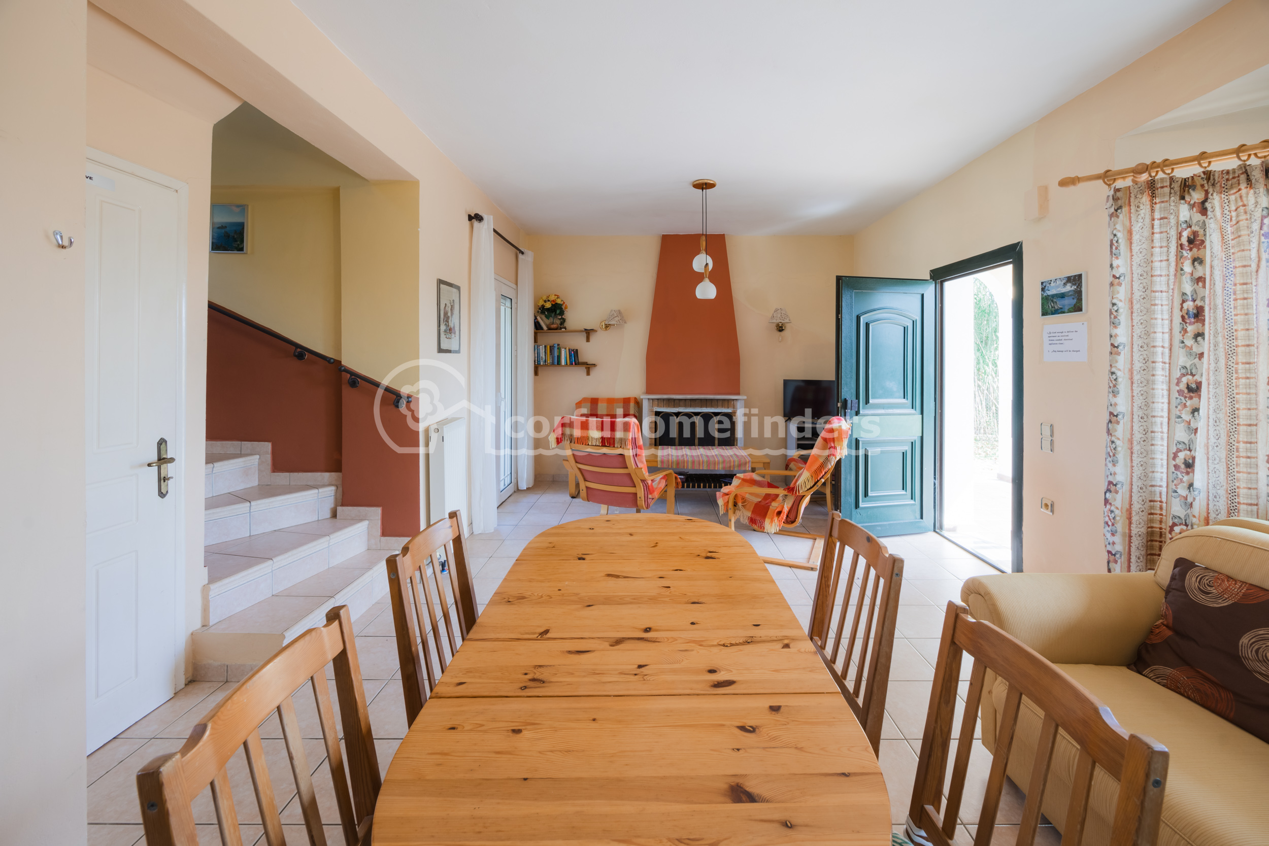 The main entrance leads into an open plan room with the kitchen/dining area to one side and the sitting room with working fireplace at the other. There is a small storage room/WC under the stairs also. Balcony doors lead from the sitting room out to a covered terrace and the garden at the back.
