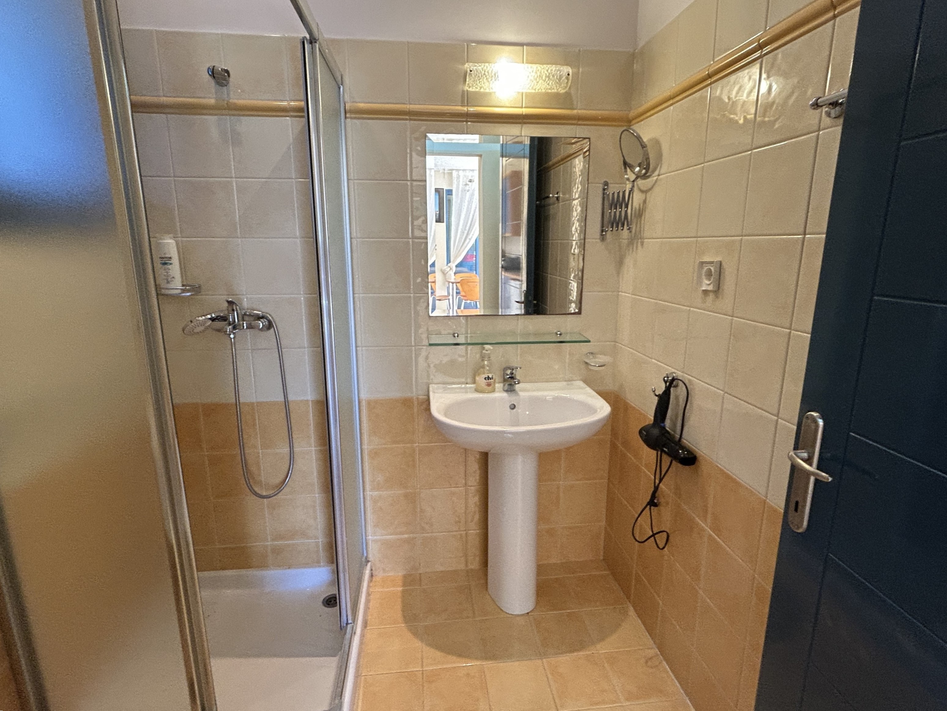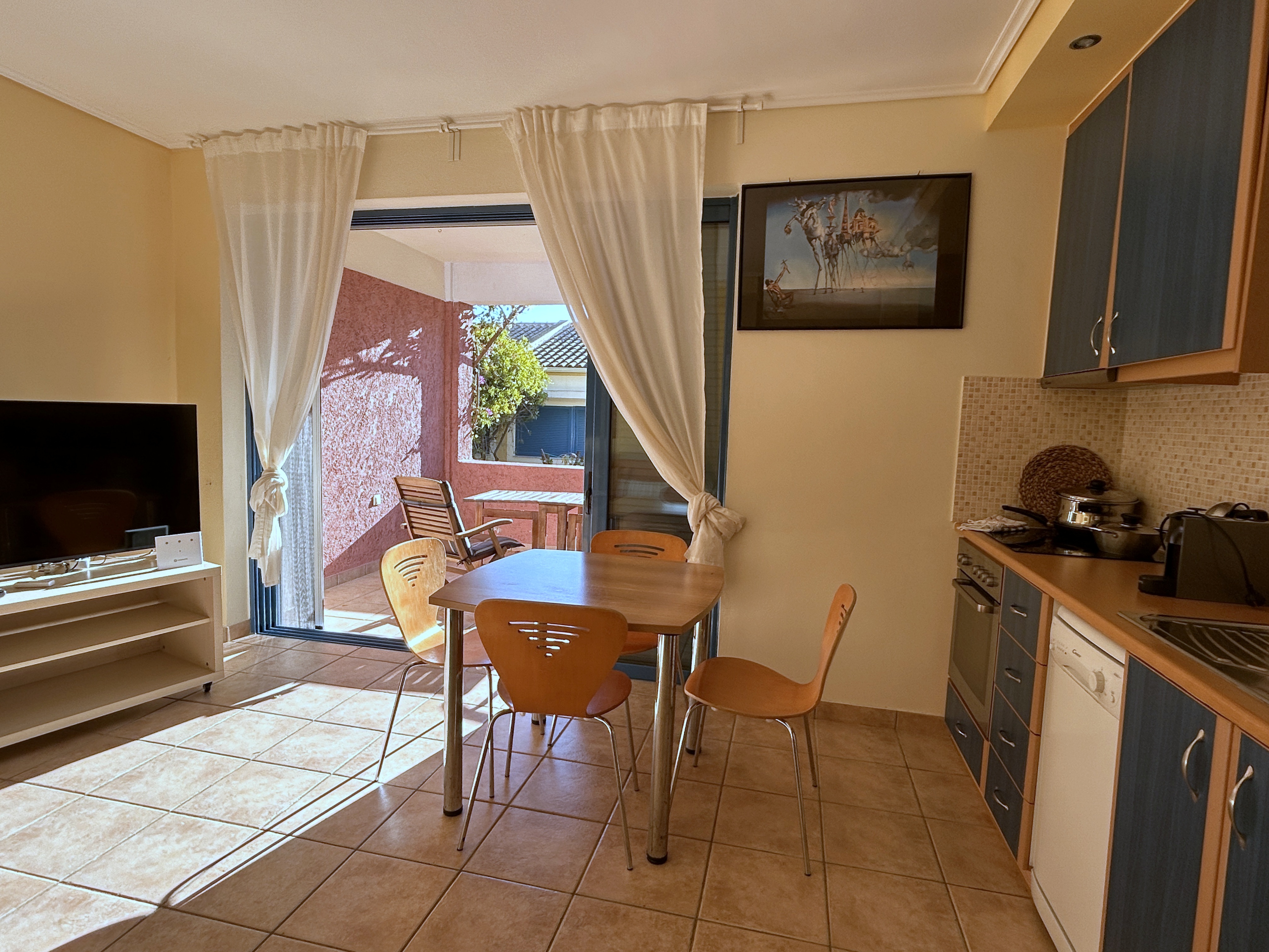 The apartments are identical in design, one on the upper floor and one on the lower floor. Inside there is an open-plan room with a kitchen and eating/sitting area and large sliding doors out to the spacious terrace. At the back of the apartment is the bedroom and shower room.