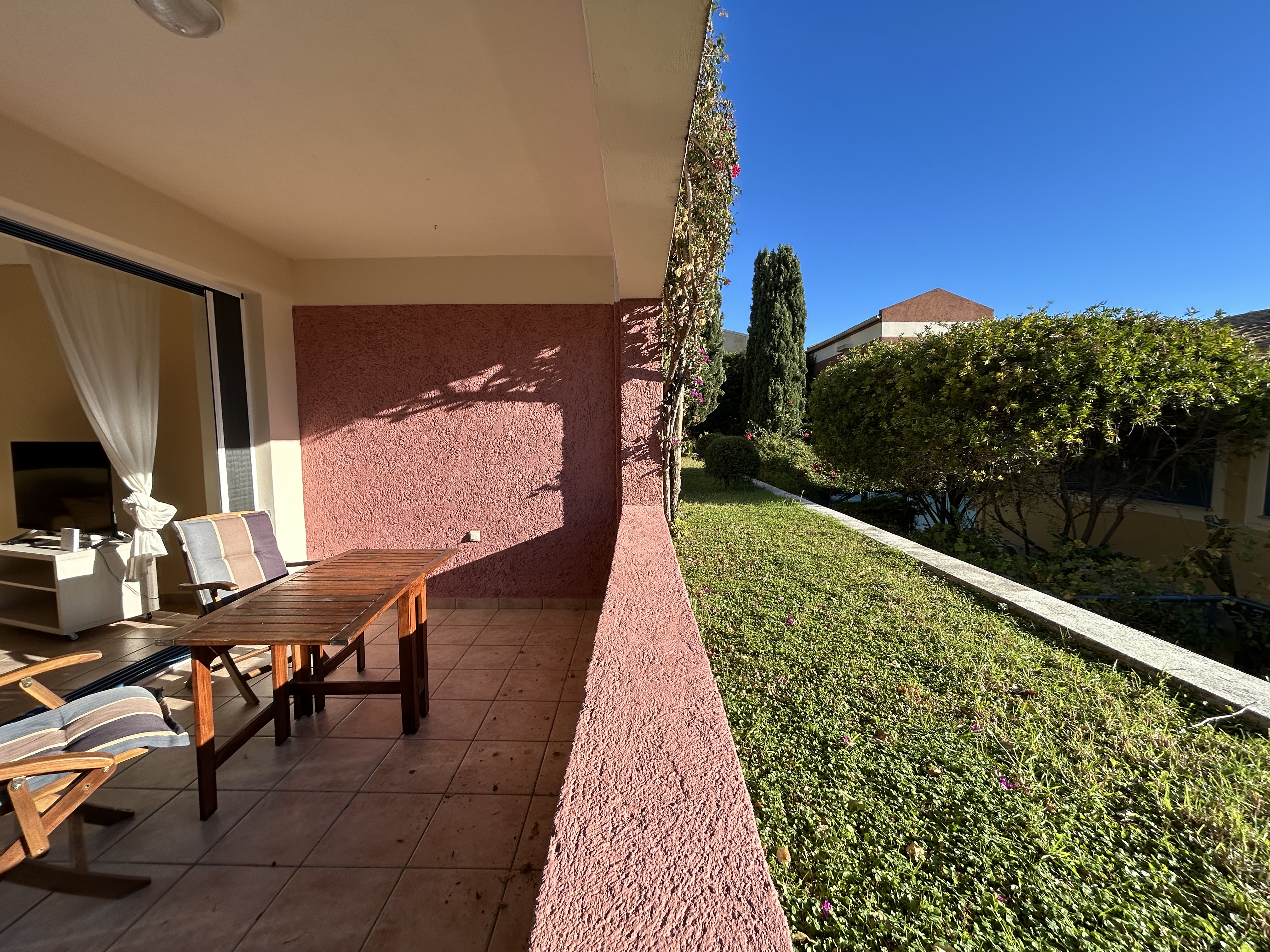 The upper floor apartment has sea views from the balcony, whereas the downstairs apartments looks out over the gardens.