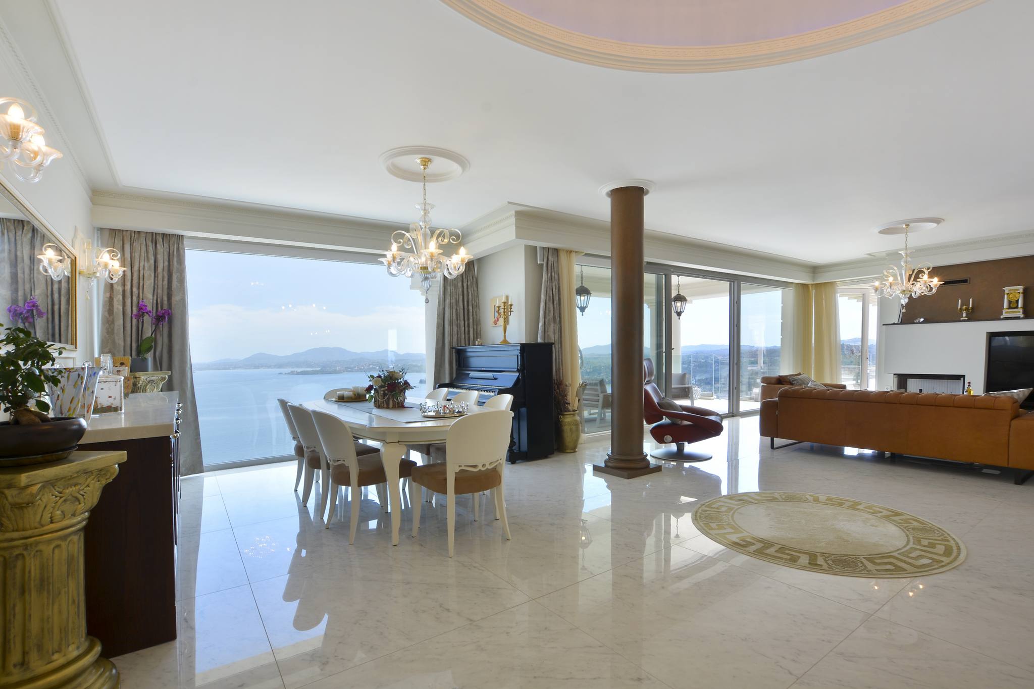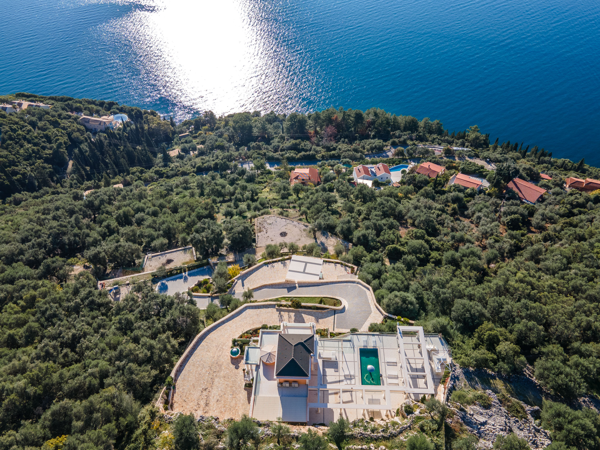 A sweeping driveway leads up towards the top of the plot where the villa is located. The main entrance leads into a spacious room with a modern kitchen in Greek revival style to one side which features an impressive domed skylight. The dining and sitting room have floor to ceiling windows allowing the light to pour in and the views to take centre stage. There is access to the swimming pool and patio area from this area.