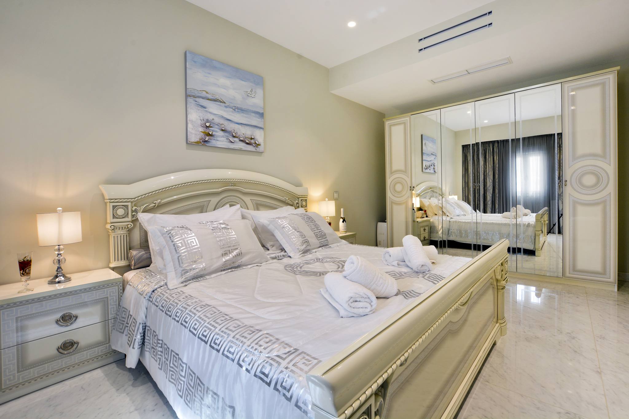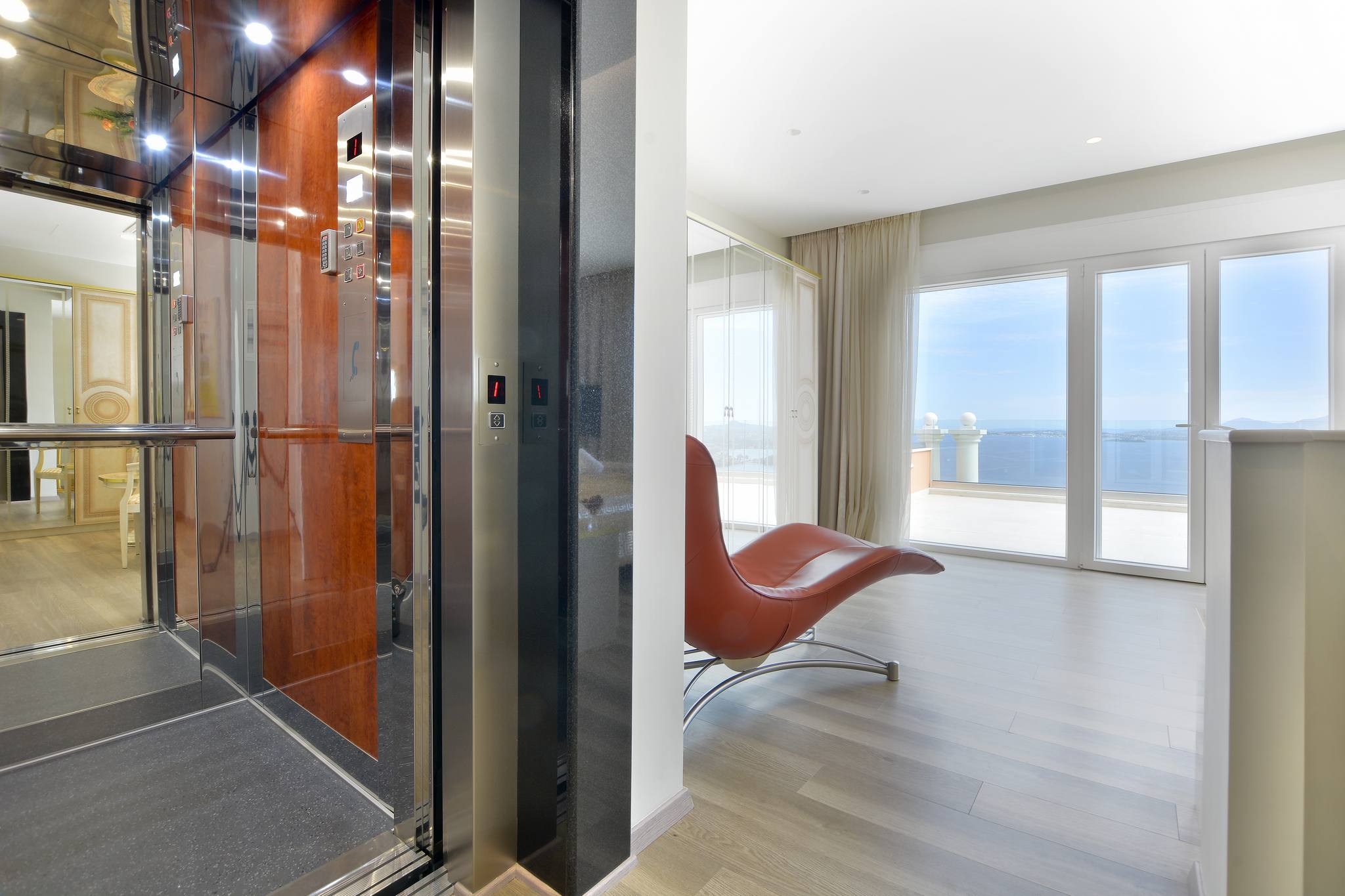 On this level there is a double bedroom with ensuite shower room, a guest WC and a modern lift connecting the three levels of the property. The top floor is dedicated to the impressive master bedroom suite, with a large terrace at the front taking in the unobstructed views.