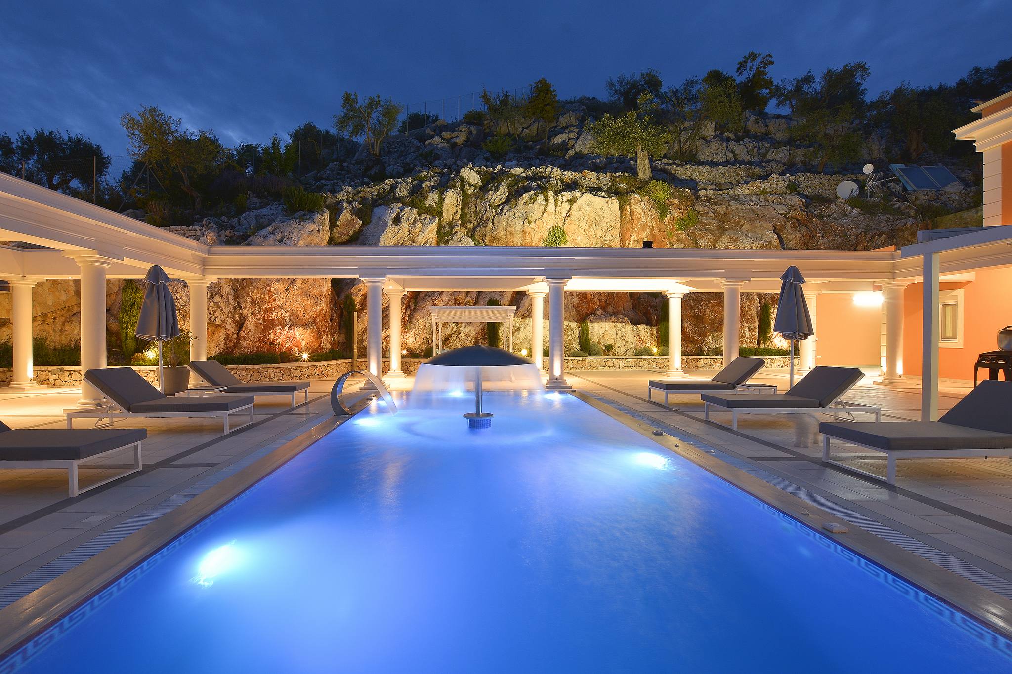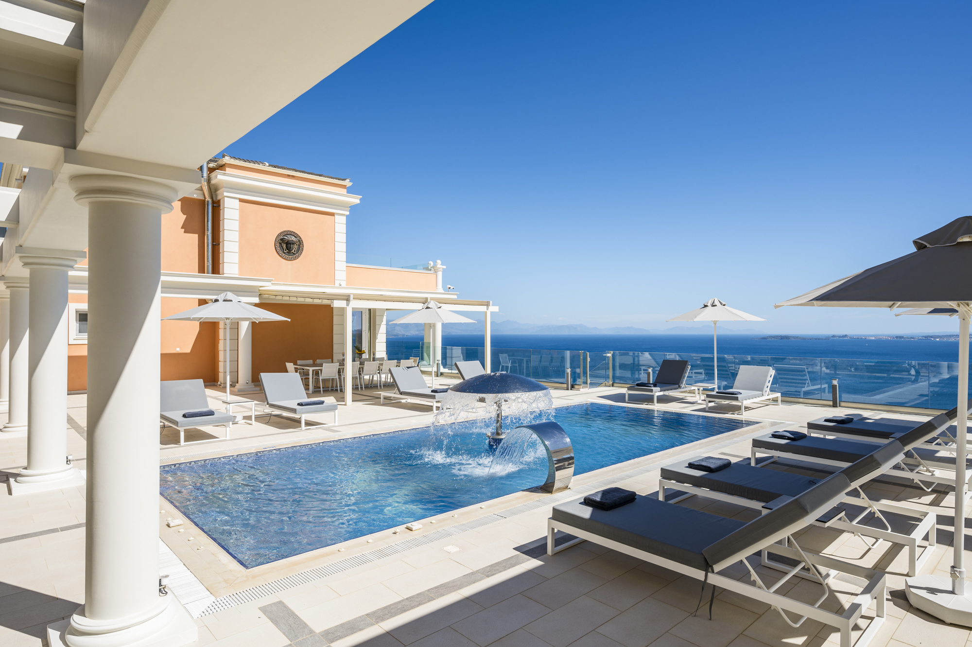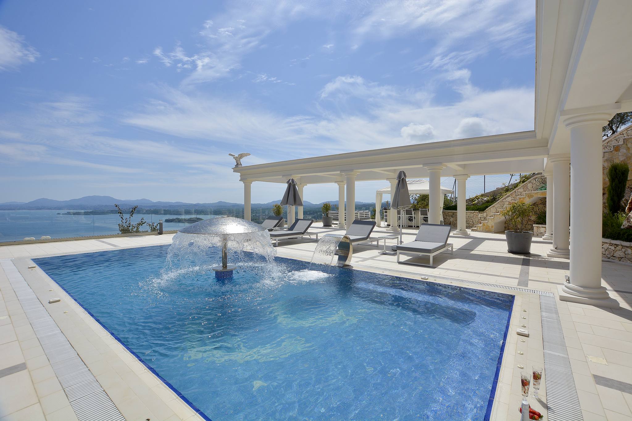 The impressive pool terrace is located at the side of the villa, offering several areas for sunbathing, lounging and outdoor dining. The outdoor kitchen and BBQ area is terraced and fully equipped. The swimming pool is designed with a fountain feature, hydromassage and exercise swimming technology. There are 3 WC and showers close to the swimming pool and terraces.