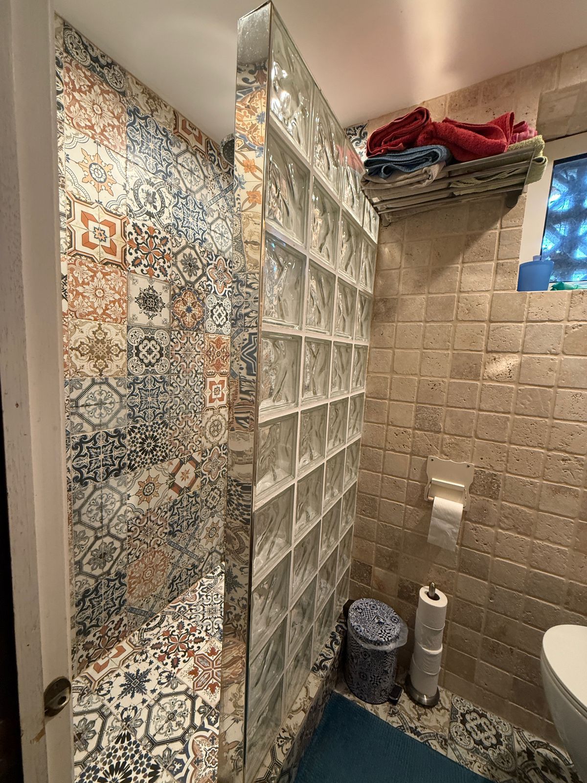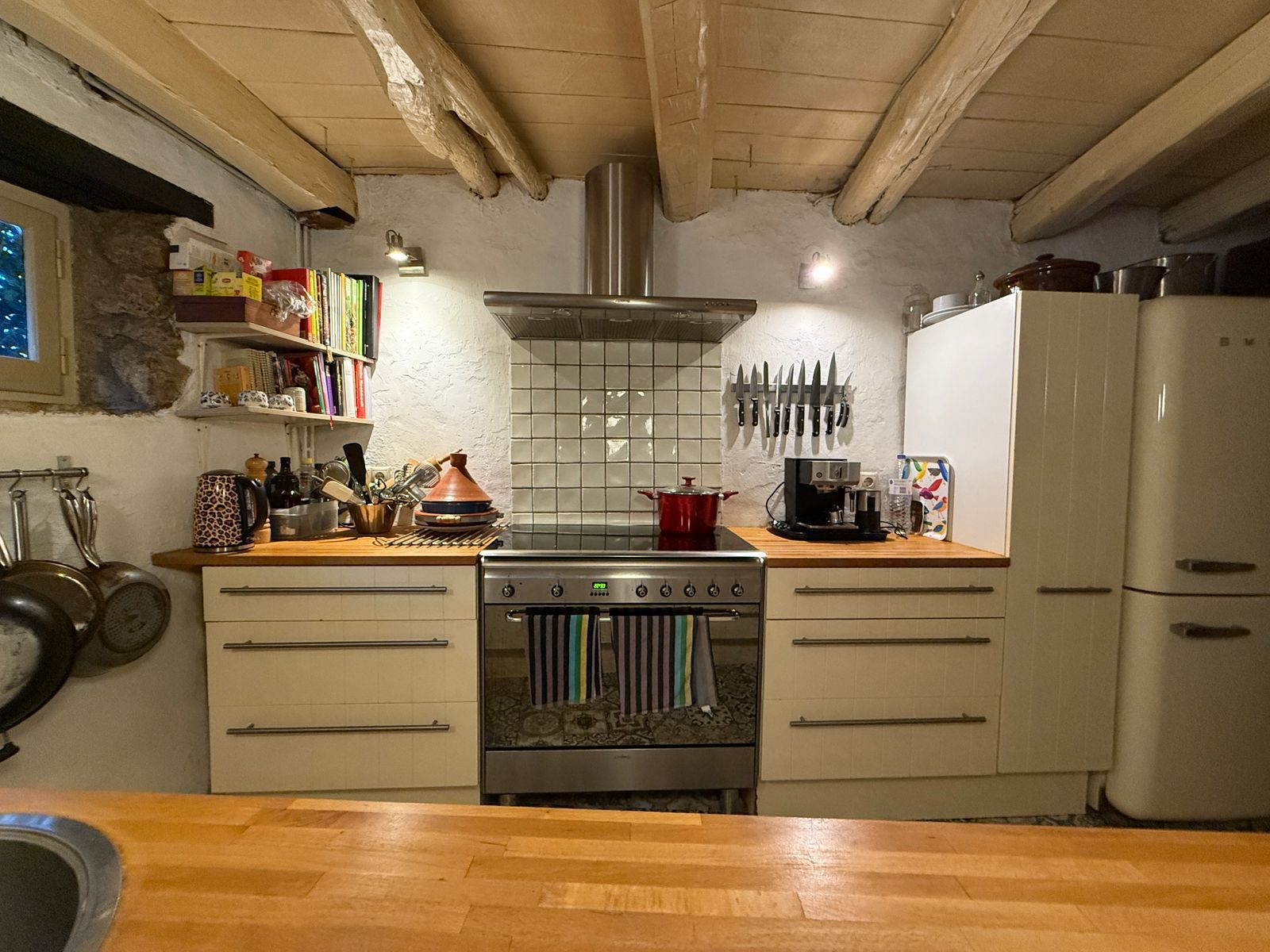 The quirky combination of modern kitchen units, wood beamed ceiling and colourful patterned floor tiles, add to the original style and welcoming atmosphere of the room. A large doorway opens out into the garden.