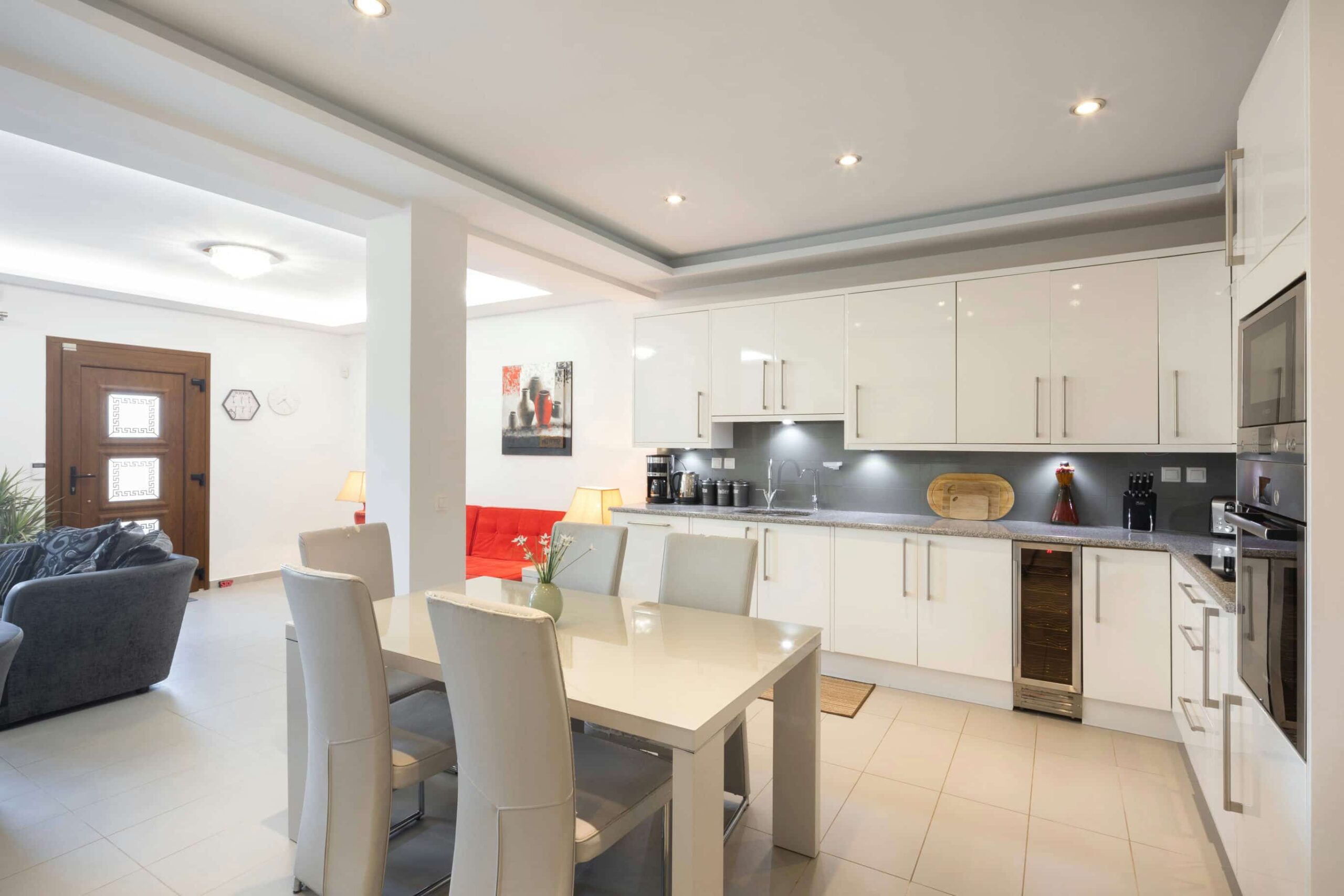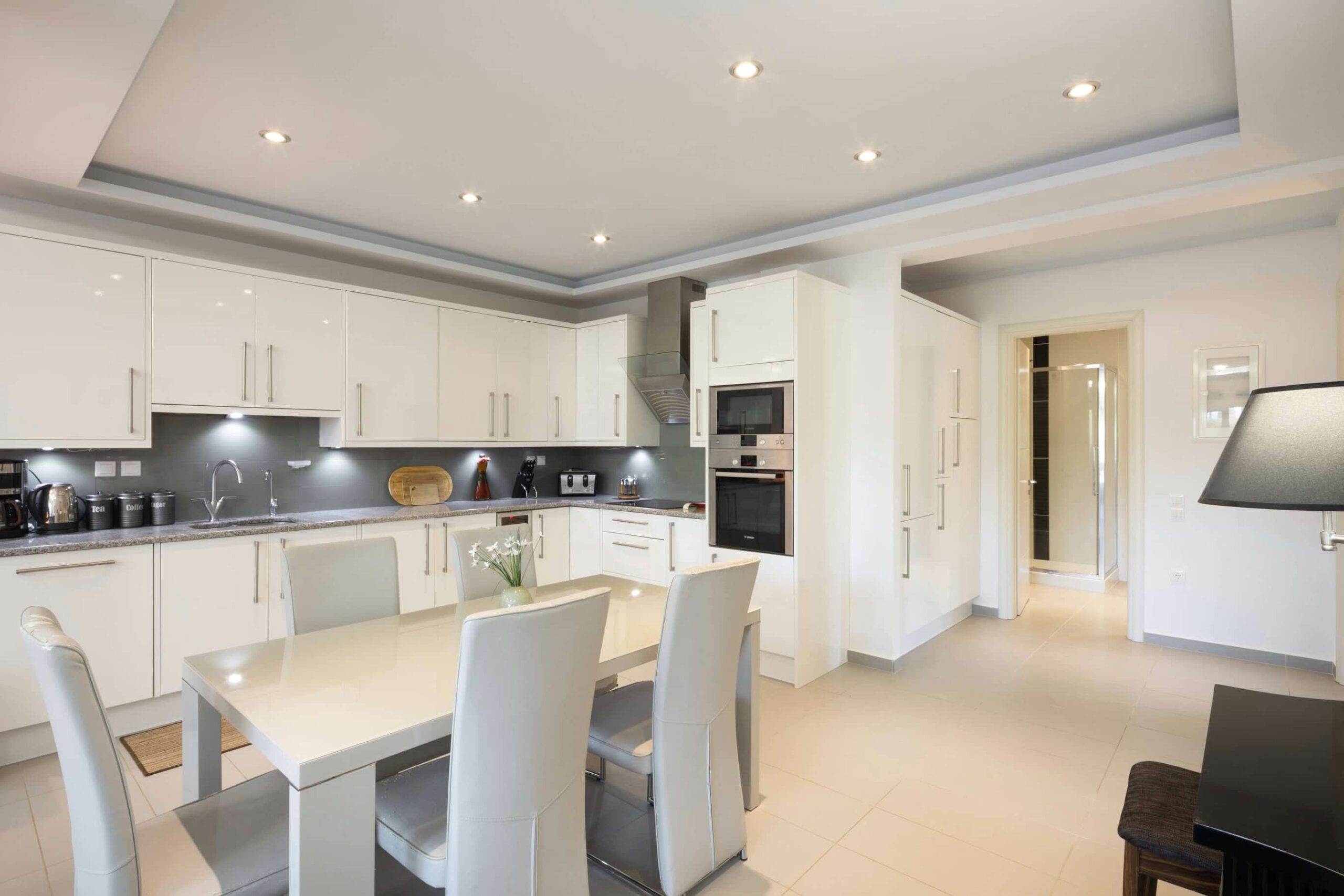 Electric gates open into a wide driveway with ample parking space for several cars. Steps lead up from the parking area to the front door and open into the open plan living area, with a modern fitted kitchen to one side and a dining area overlooking the garden and pool.