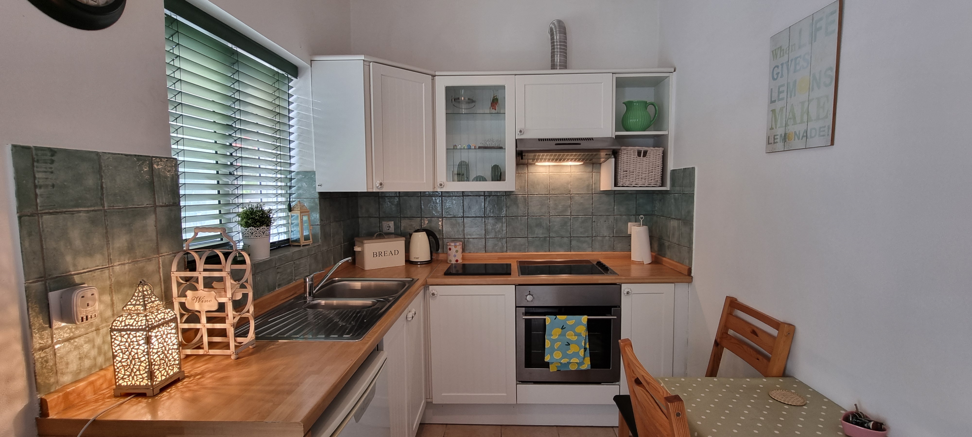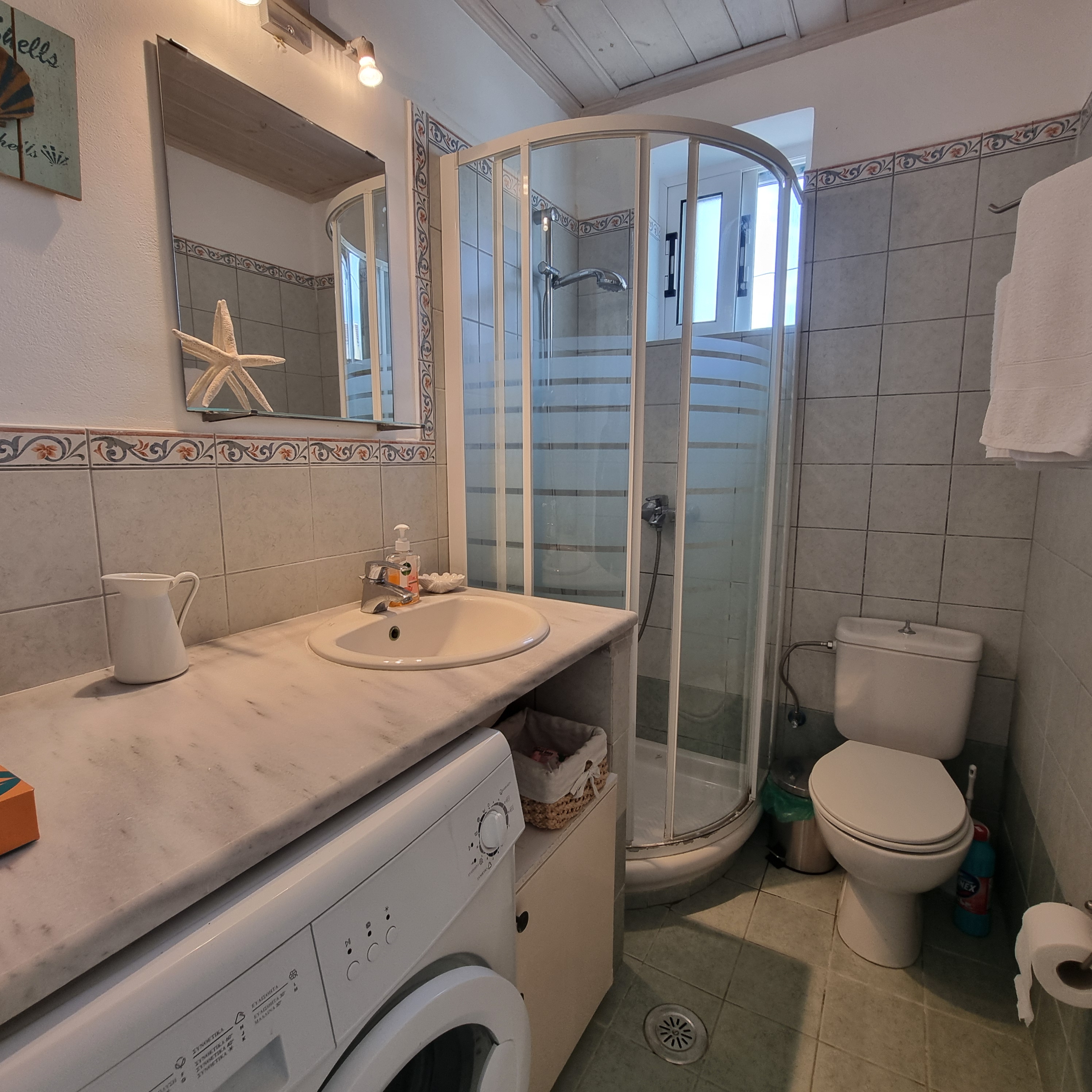 There is a fully equipped kitchen with a full hob and oven, a dining table and a sofa and a TV. The shower room is separate and also has a full-size washing machine installed.