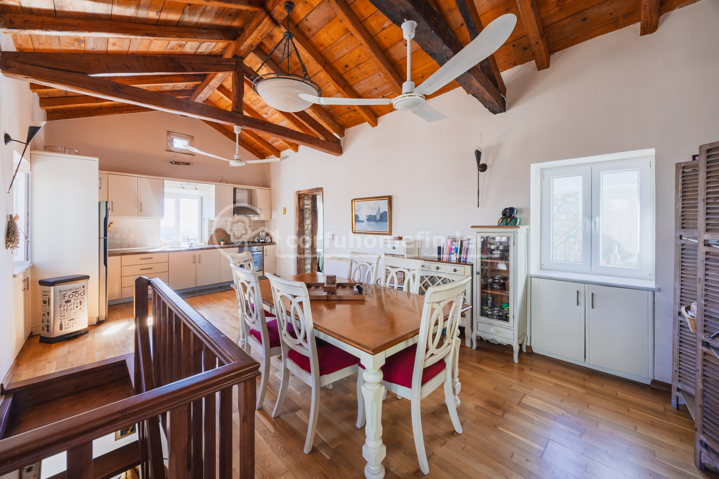 Next to the living room is a very large kitchen/dining room with a high vaulted wooden ceiling. The kitchen enjoys the same view as the living room. At the end of the dining area is a large shower room.