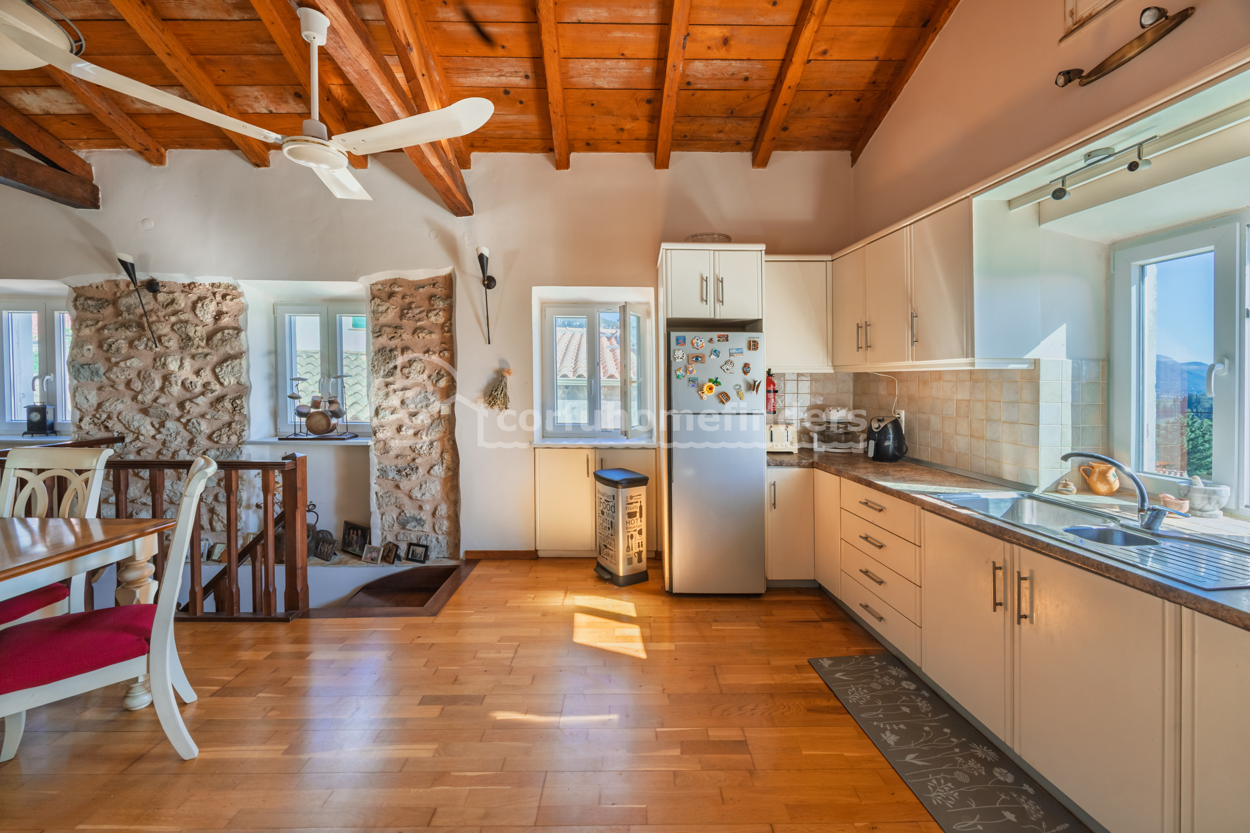 The main living accommodation is on the upper floor, which is entered through a courtyard from the village footpath. Entering into the large living room, there is a wood burning fire in one corner for cozy winter evenings. Two windows overlook the rooftops below and across the village to the mountains and distant sea view.