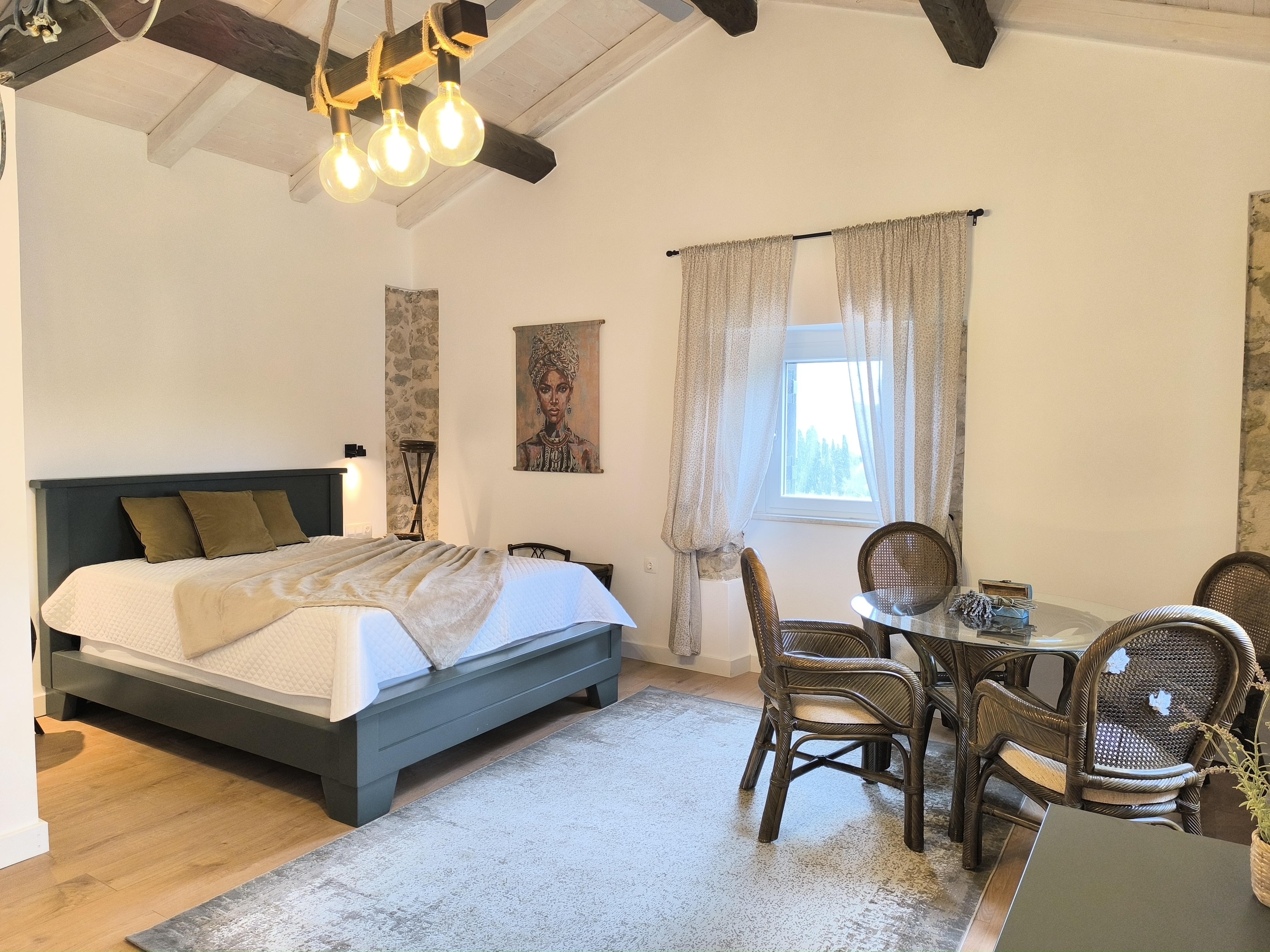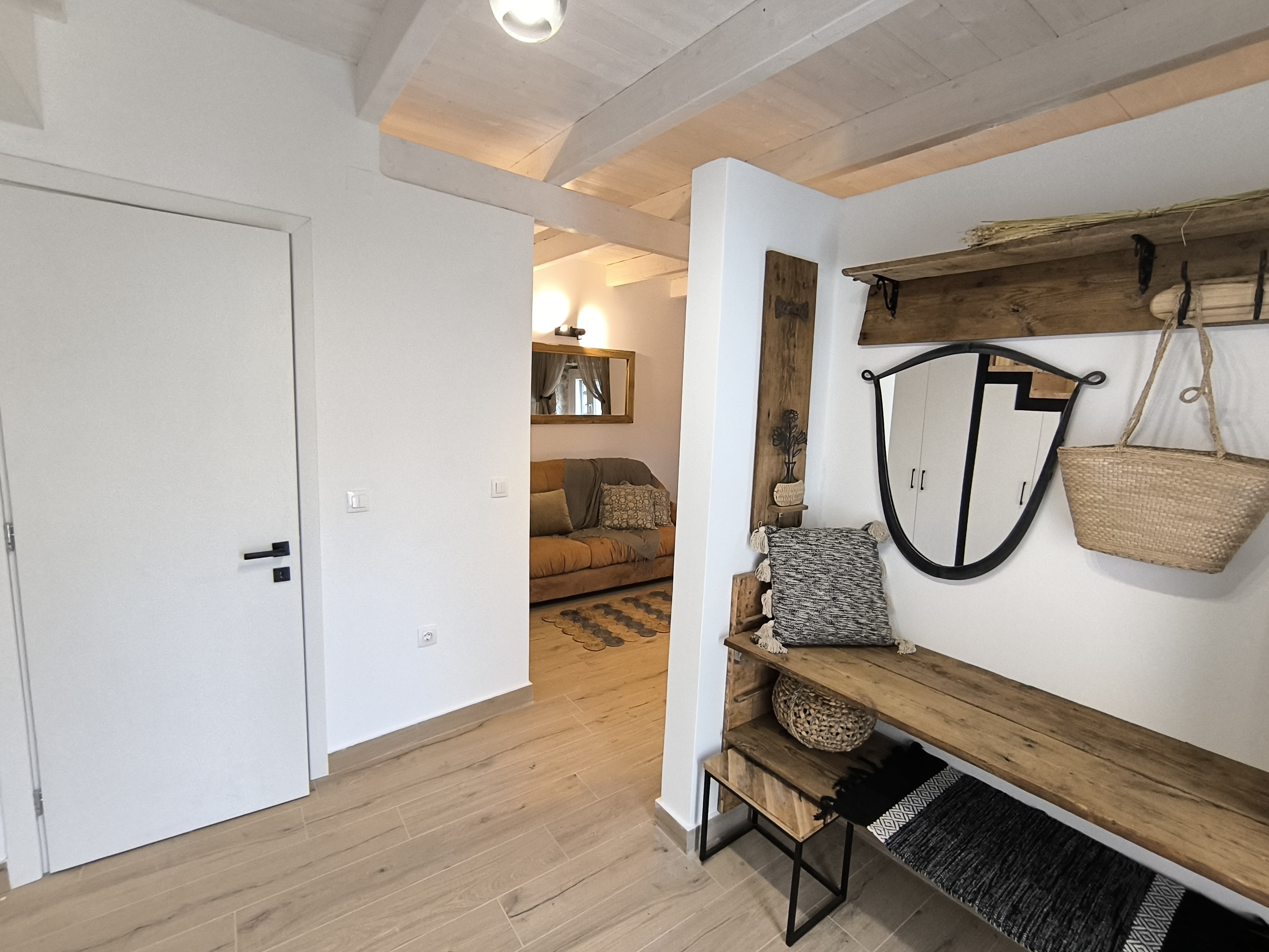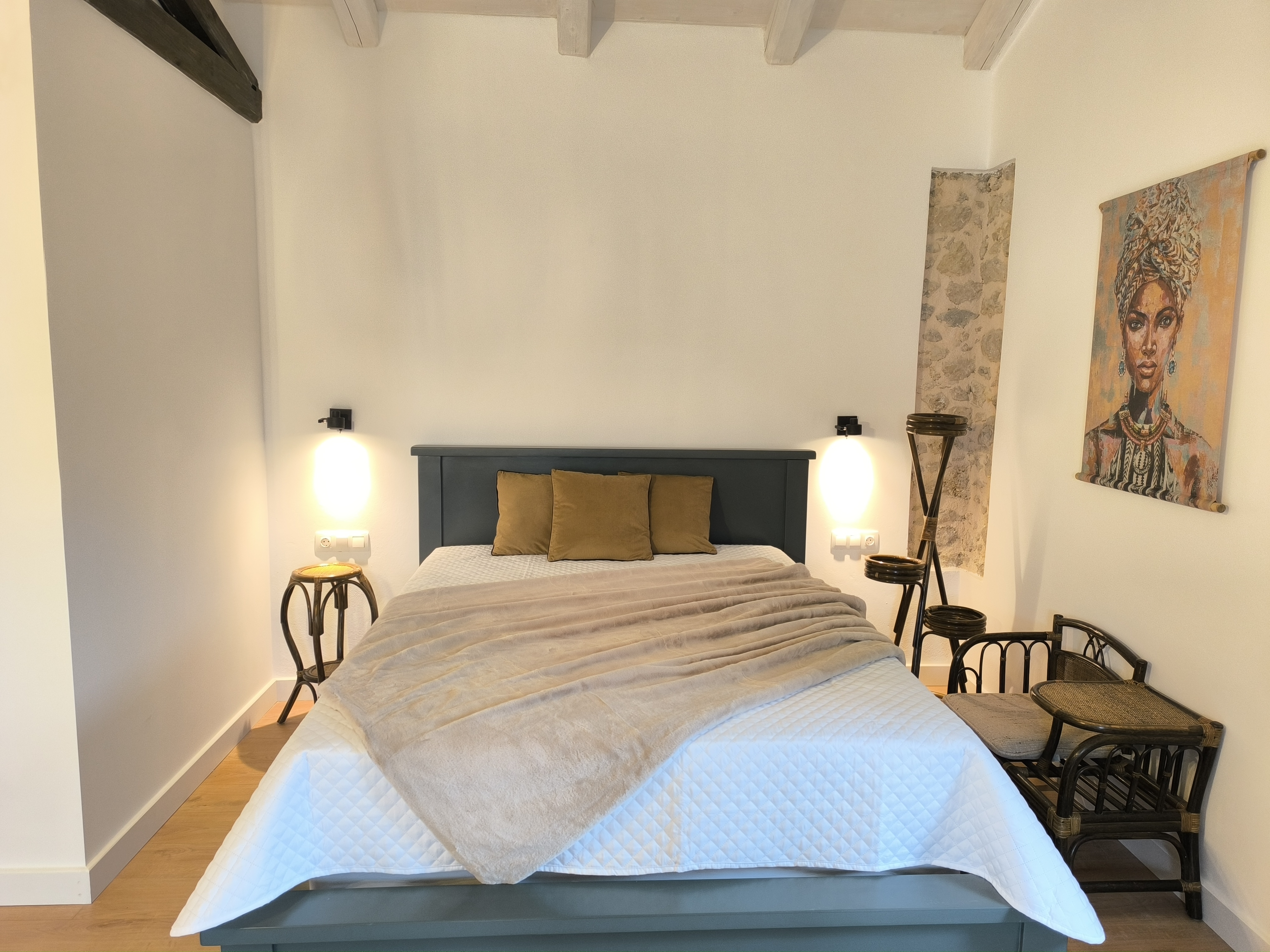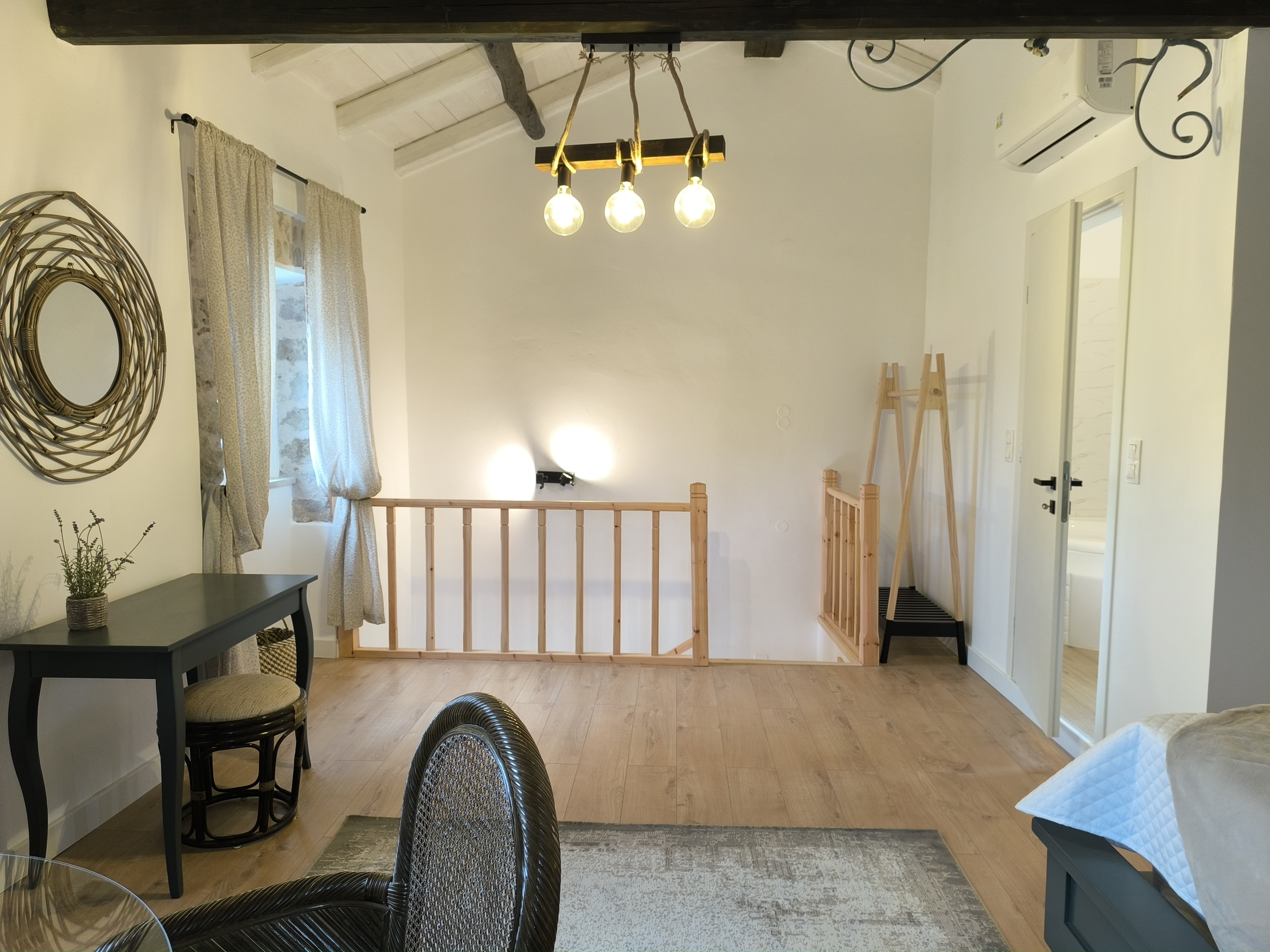 Upstairs there is a large bedroom with a high vaulted wooden ceiling. There is a bathroom on this floor complete with jacuzzi bathtub. Attention to has been paid to retain as many original features, such as the old beams and stone features on the walls. There is air conditioning here as well as in the sitting room downstairs.