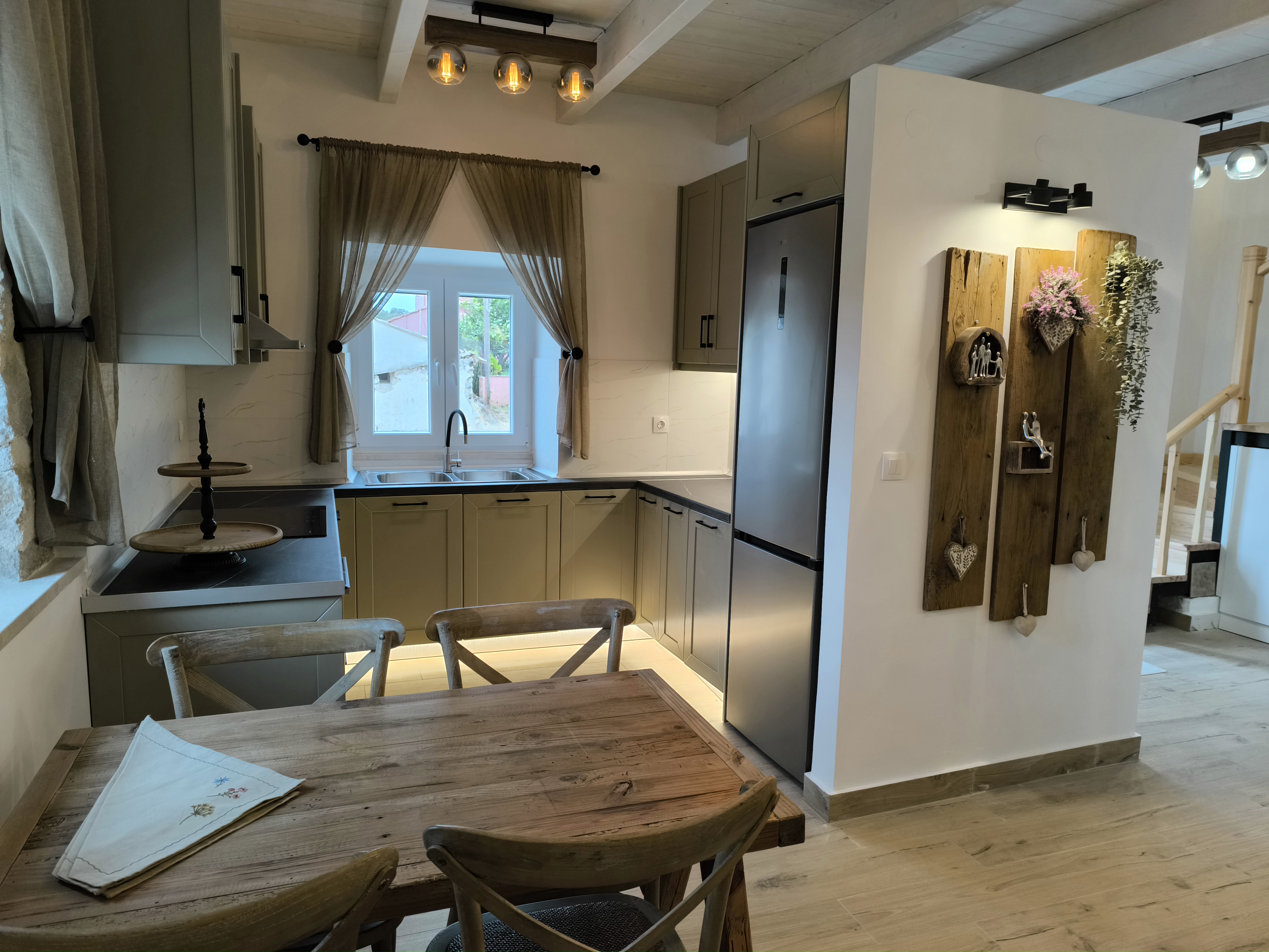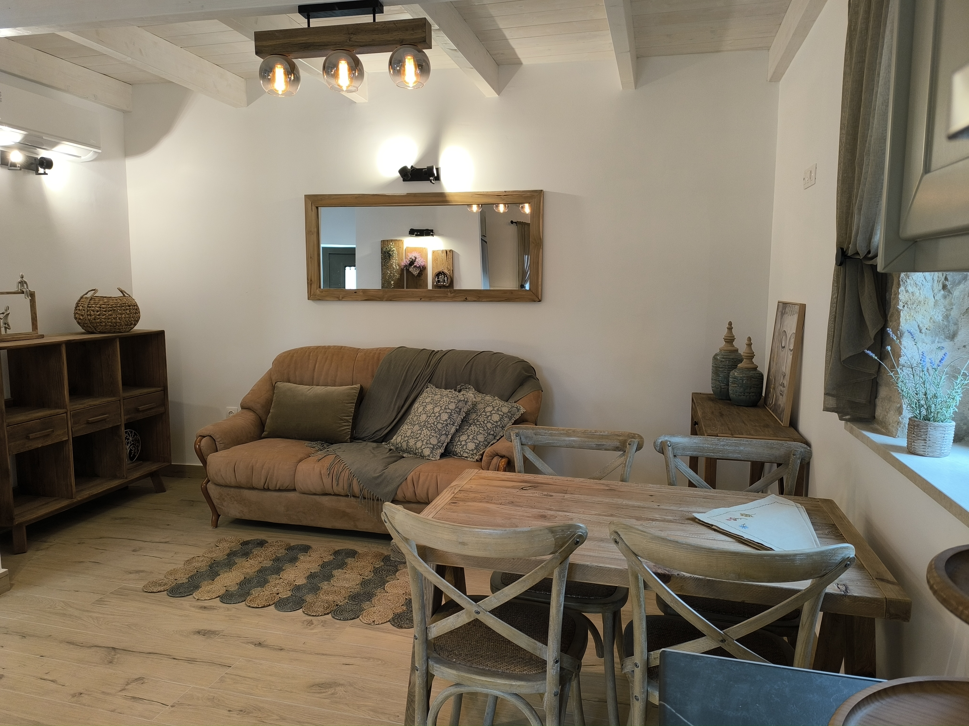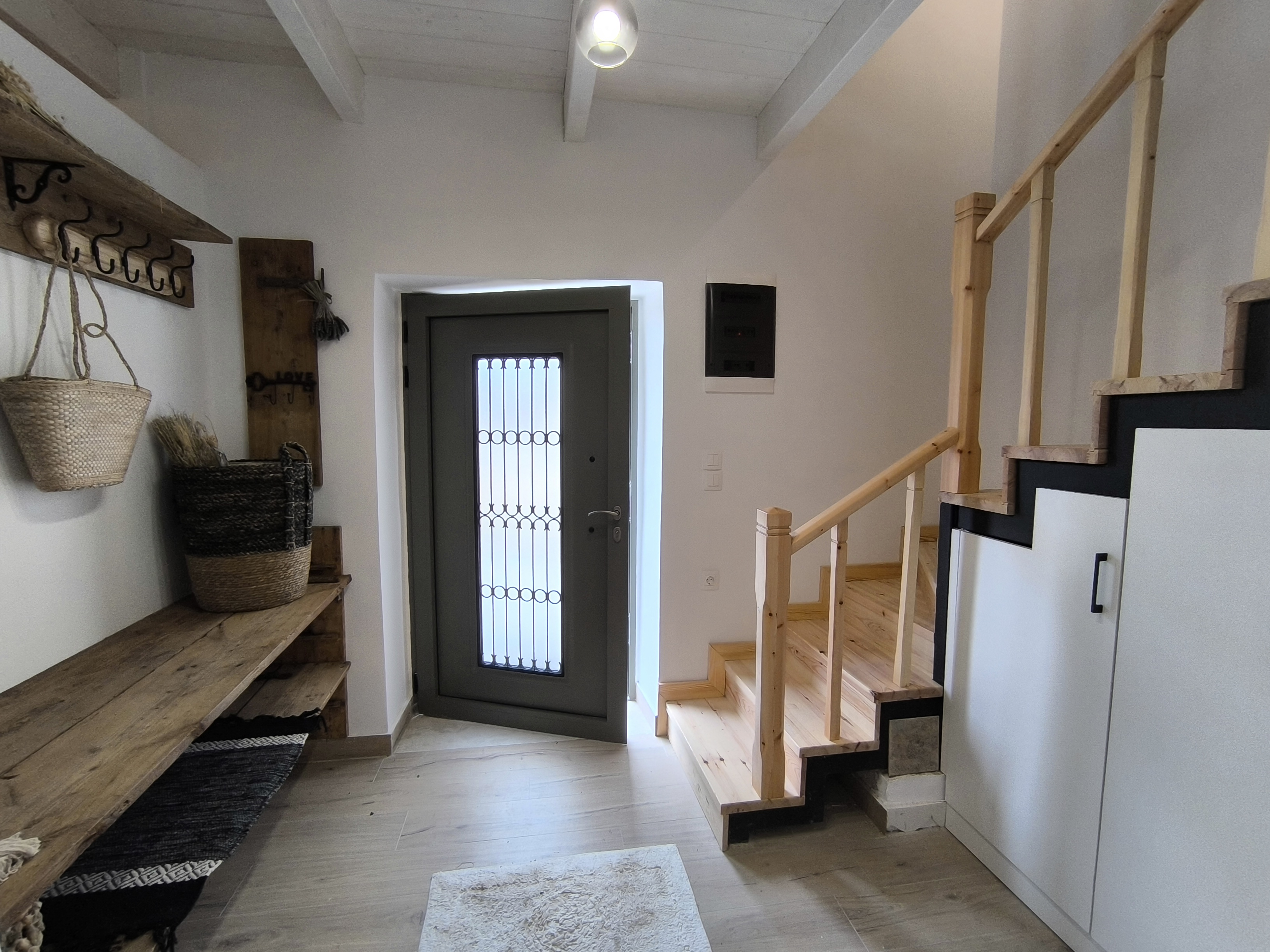 The property can be reached either via a footpath from the main square or via a narrow road (wide enough for a small car) which leads to the private parking space below the house. There is a small garden surrounding the house on two sides, and paved areas for outdoor seating and dining.