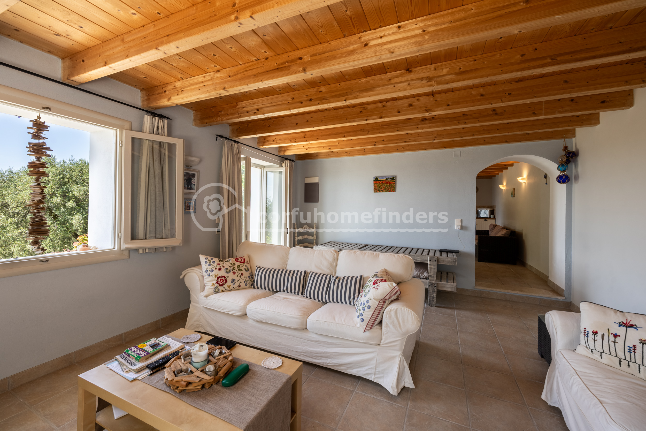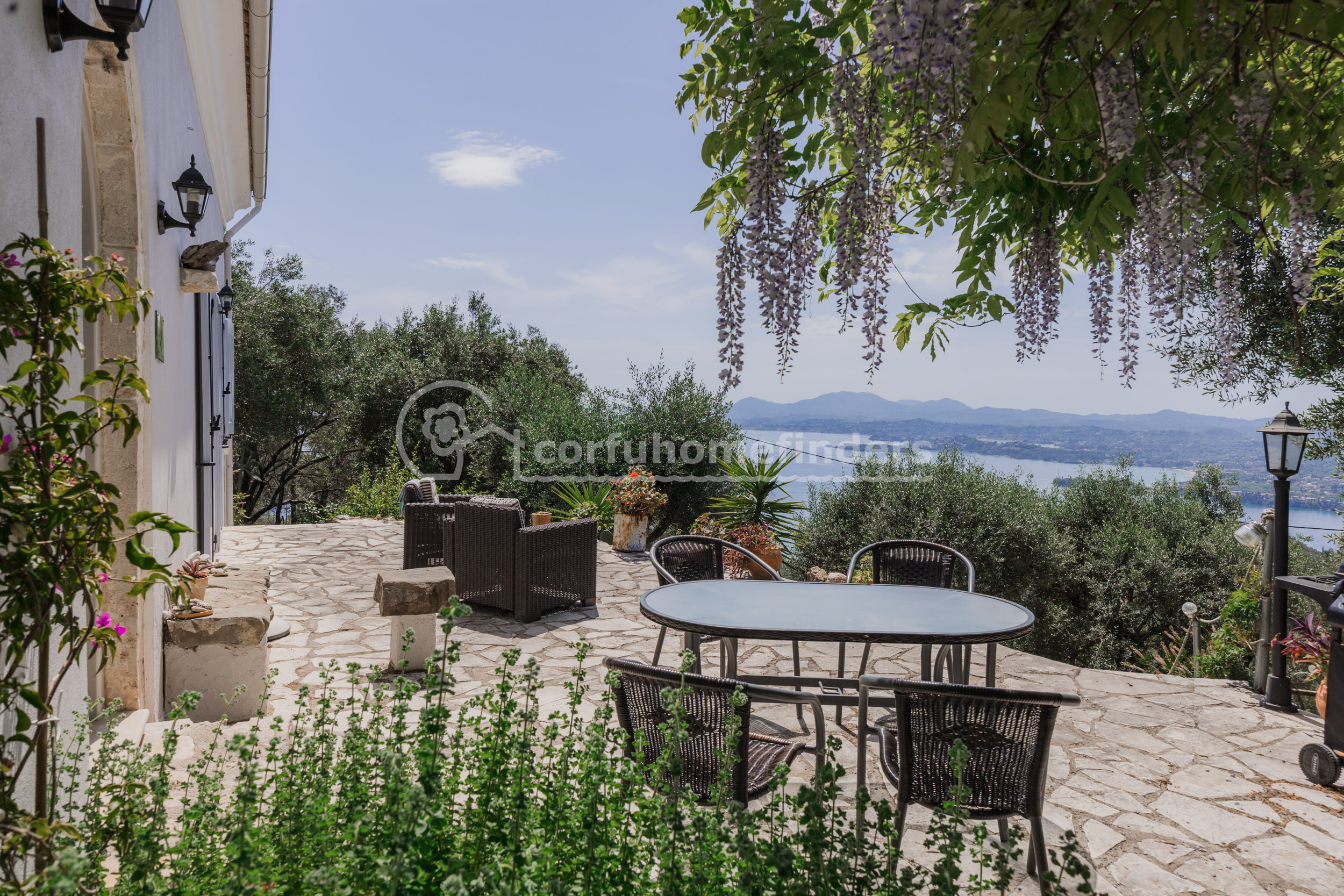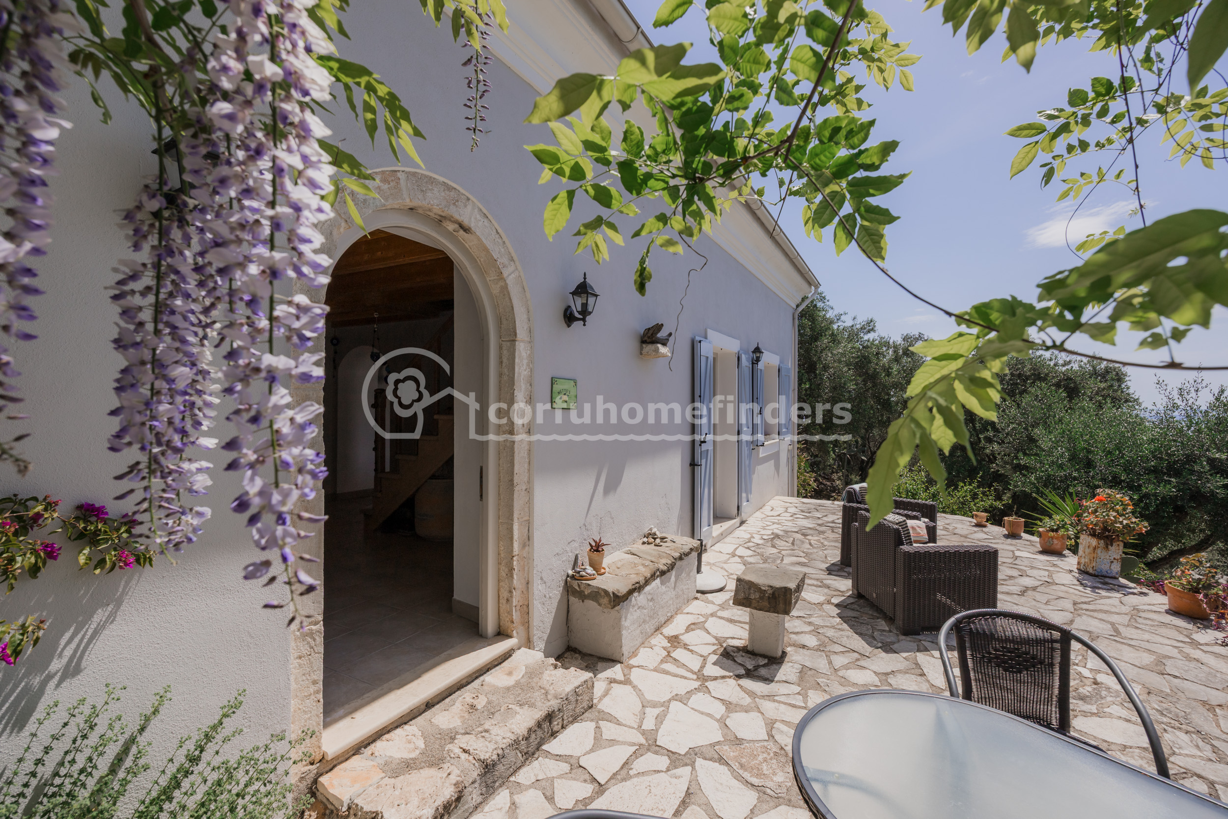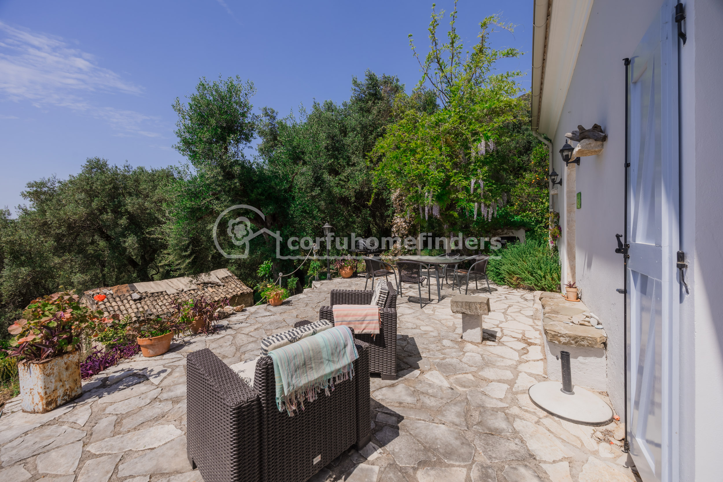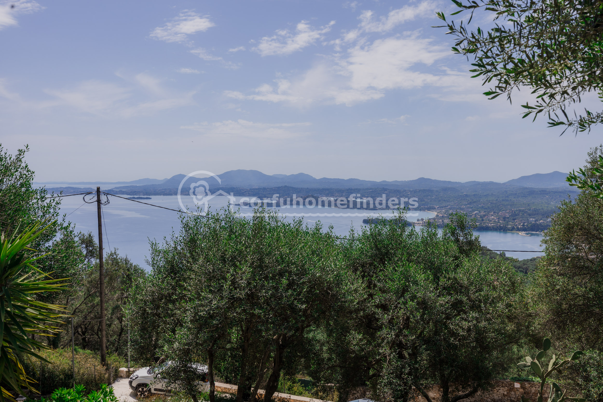 The house sits at the top of the plot and has lovely views through the trees towards the sea and Corfu town in the distance. Steps lead up from the parking areathrough the olive grove to the house, to a large paved terrace and bbq area, perfectly positioned to take in the views.