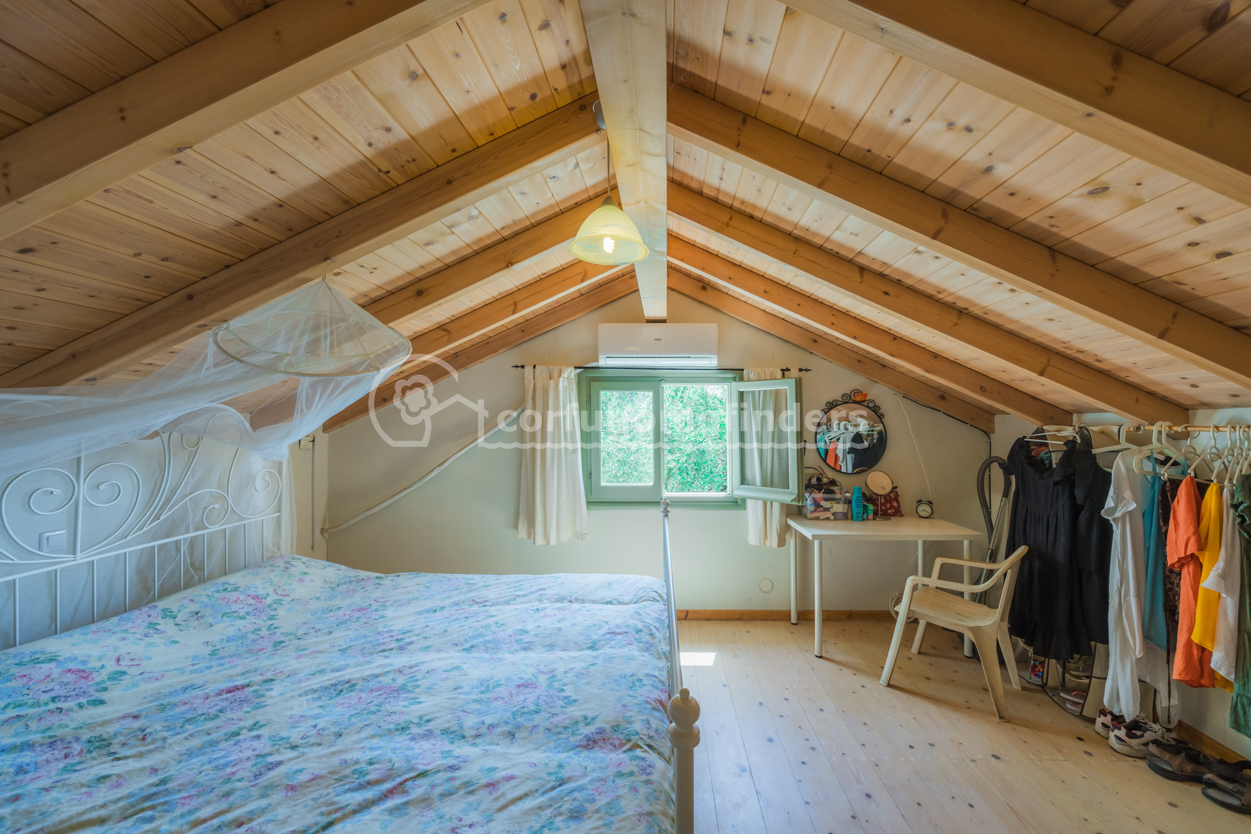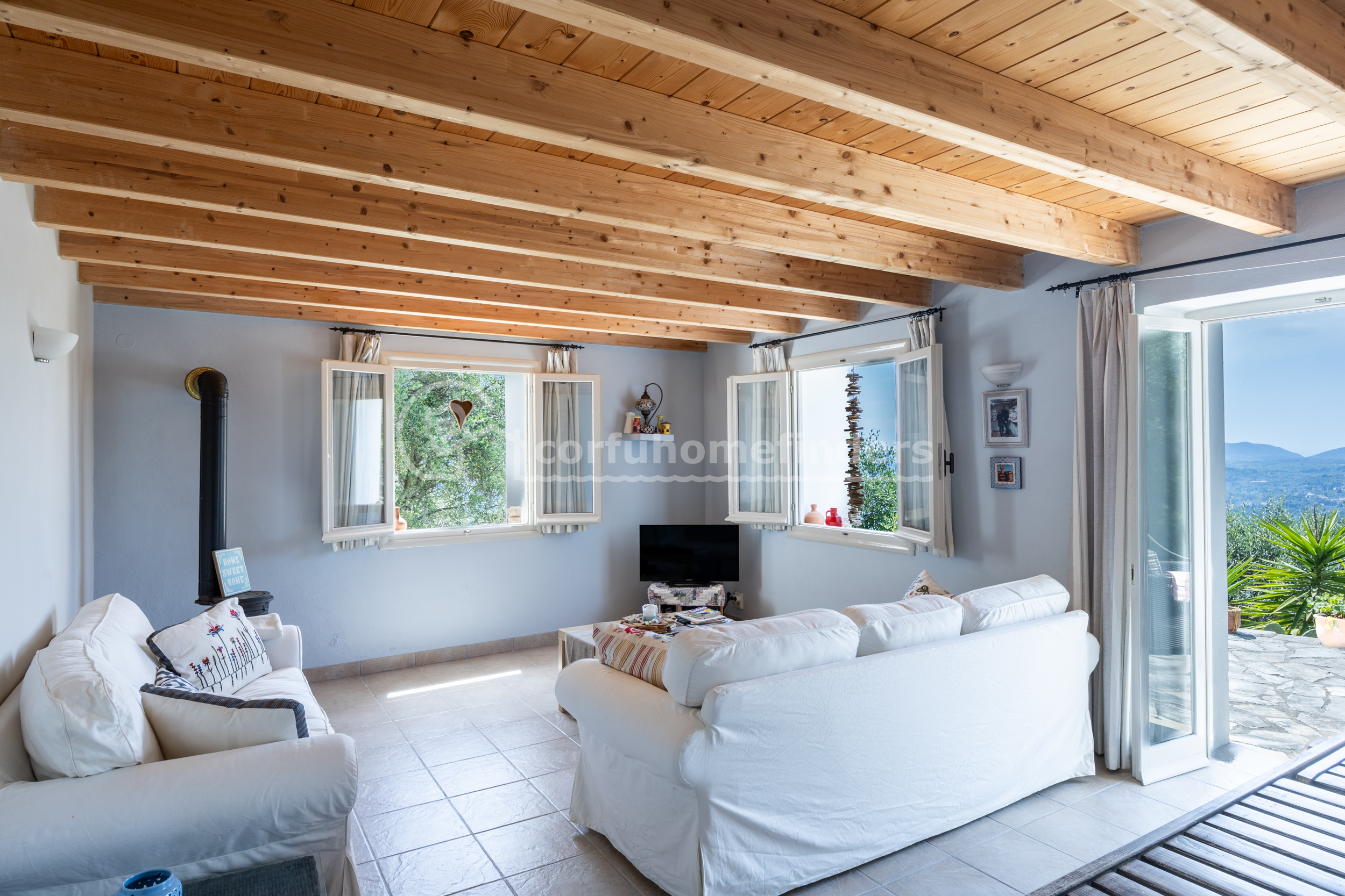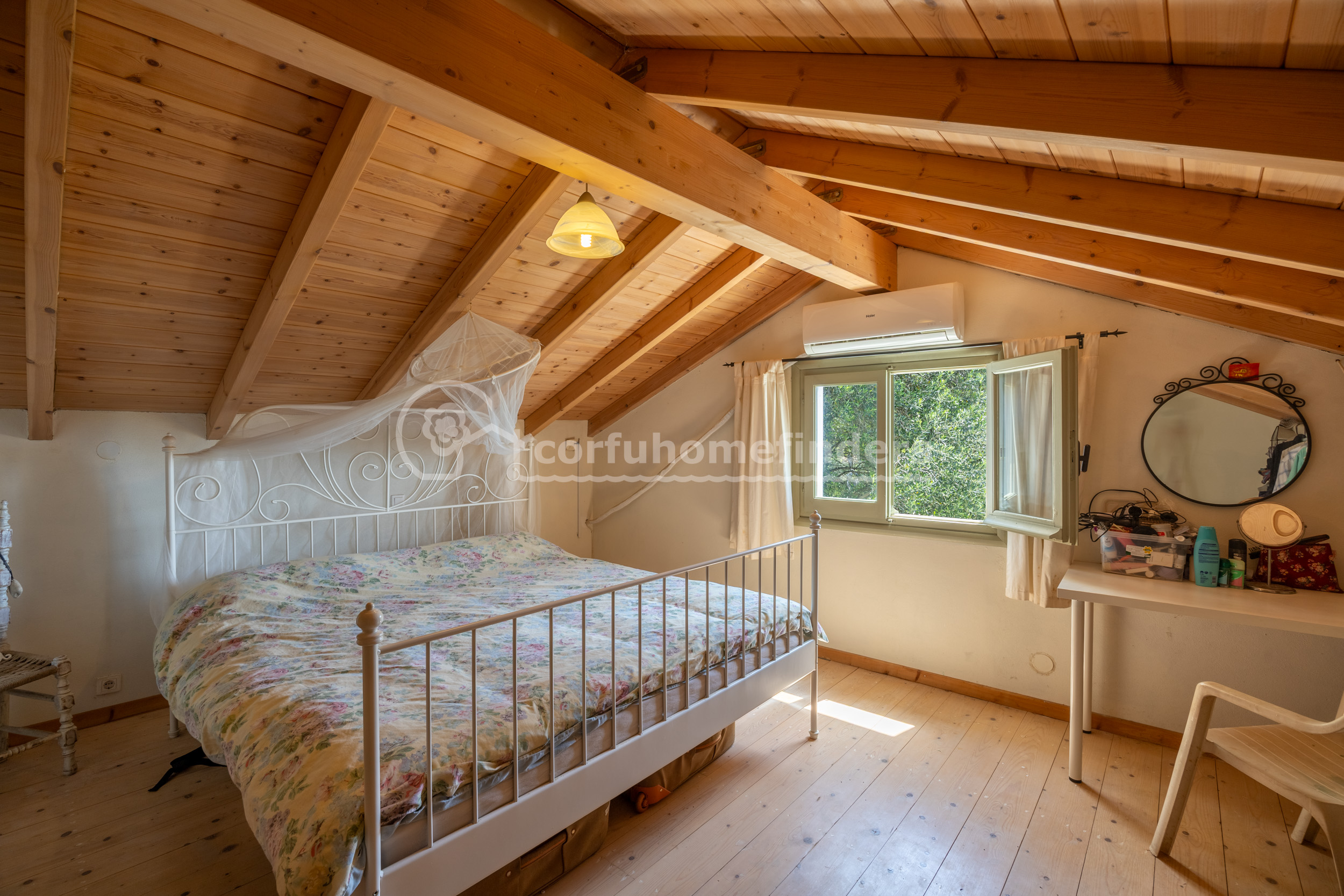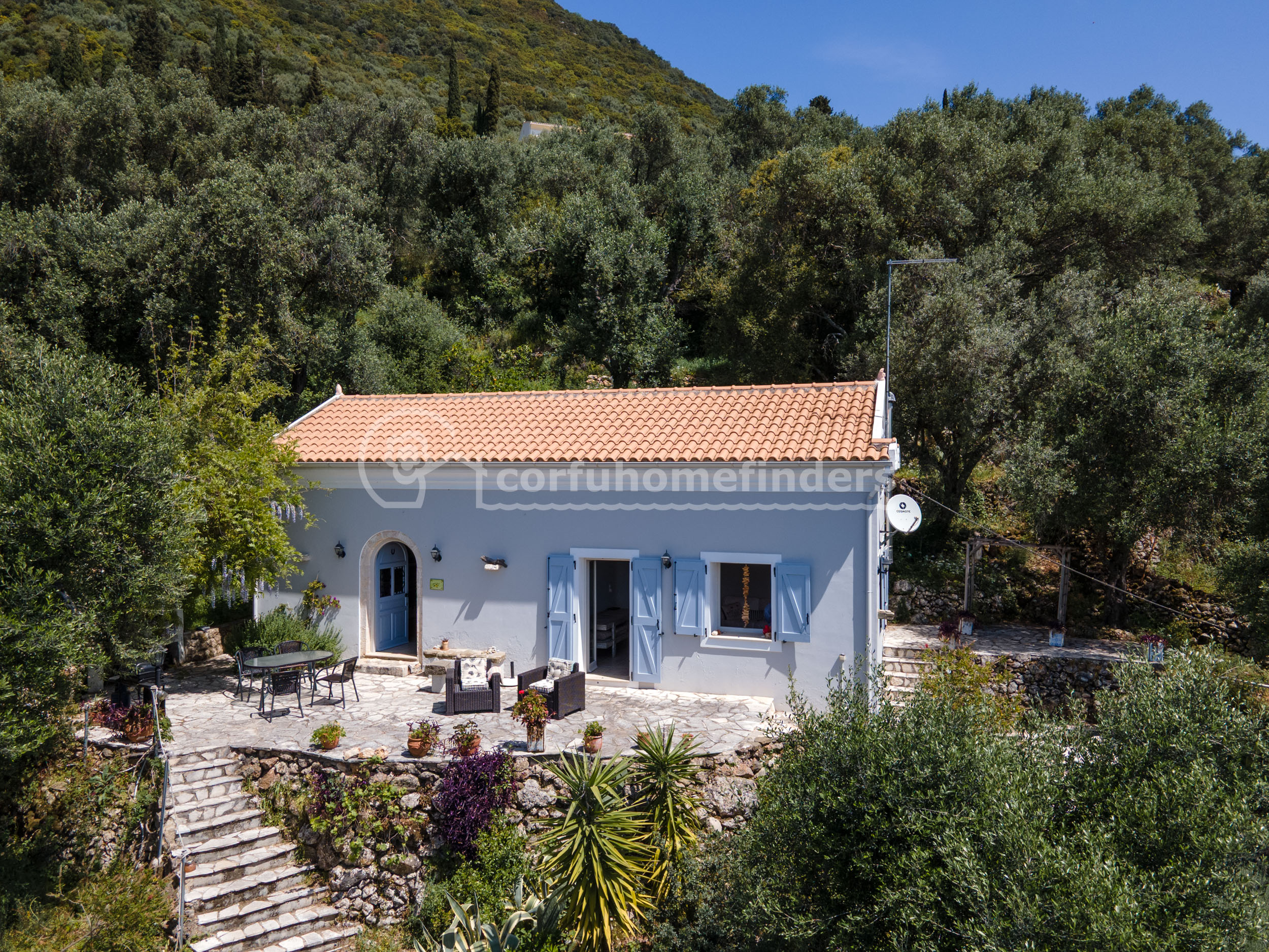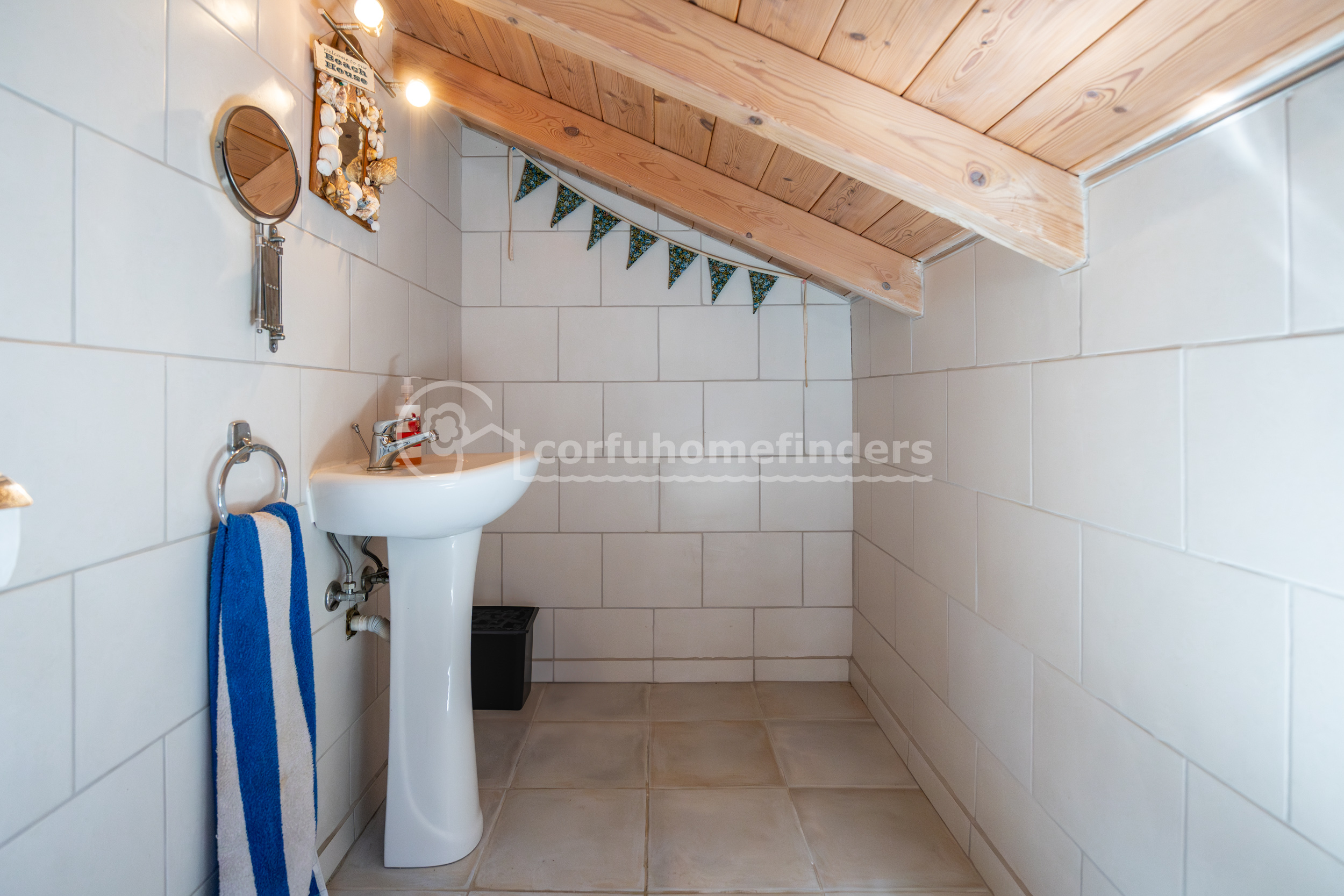 The house sits at the top of the plot and has lovely views through the trees towards the sea and Corfu town in the distance. Steps lead up from the parking areathrough the olive grove to the house, to a large paved terrace and bbq area, perfectly positioned to take in the views.