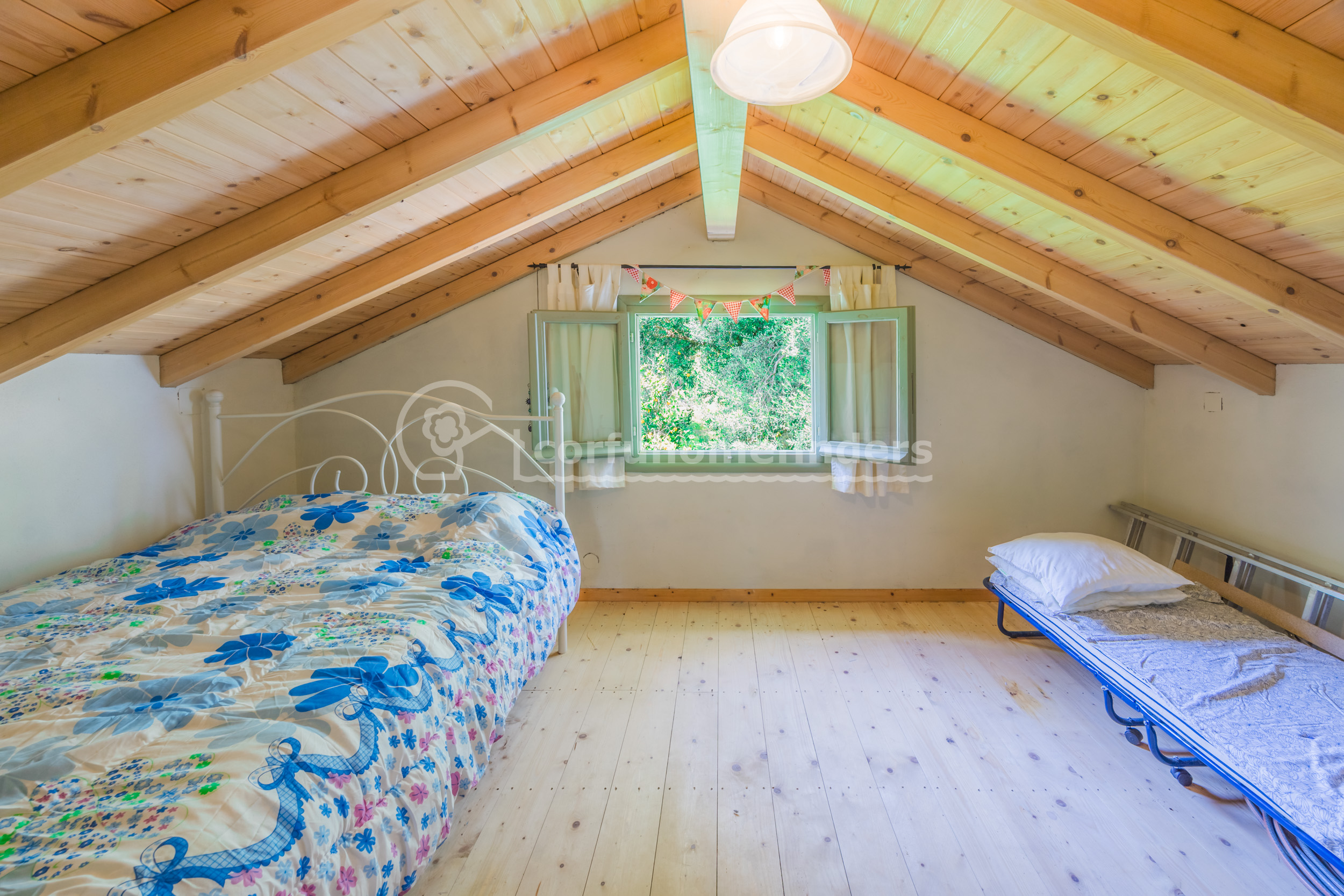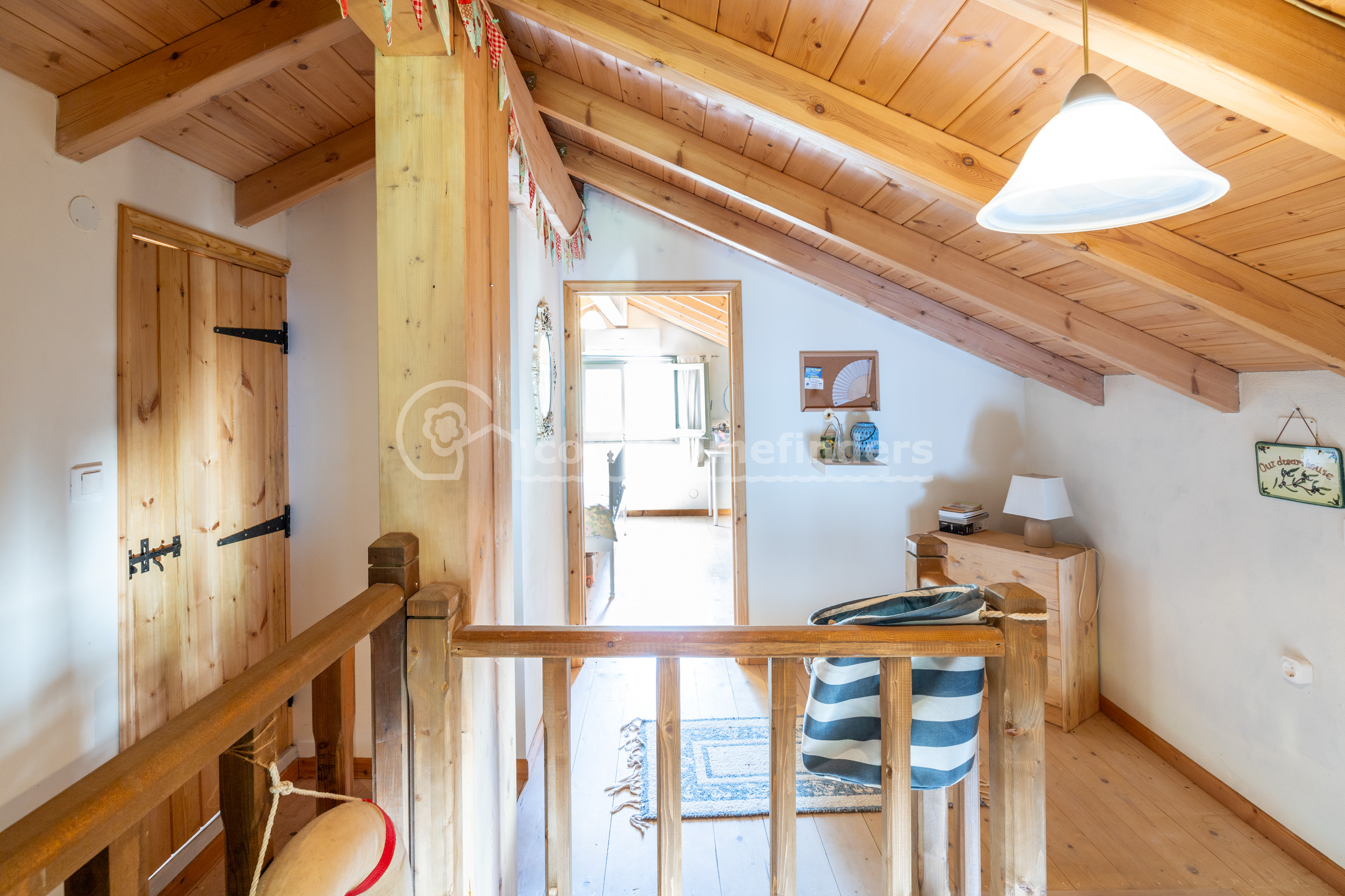 Inside there is a spacious kitchen/dining room, and a large sitting room with a wood burner in the corner. Balcony doors lead out to the terrace. Back in the kitchen, a wooden staircase leads up to the two bedrooms and shower room.