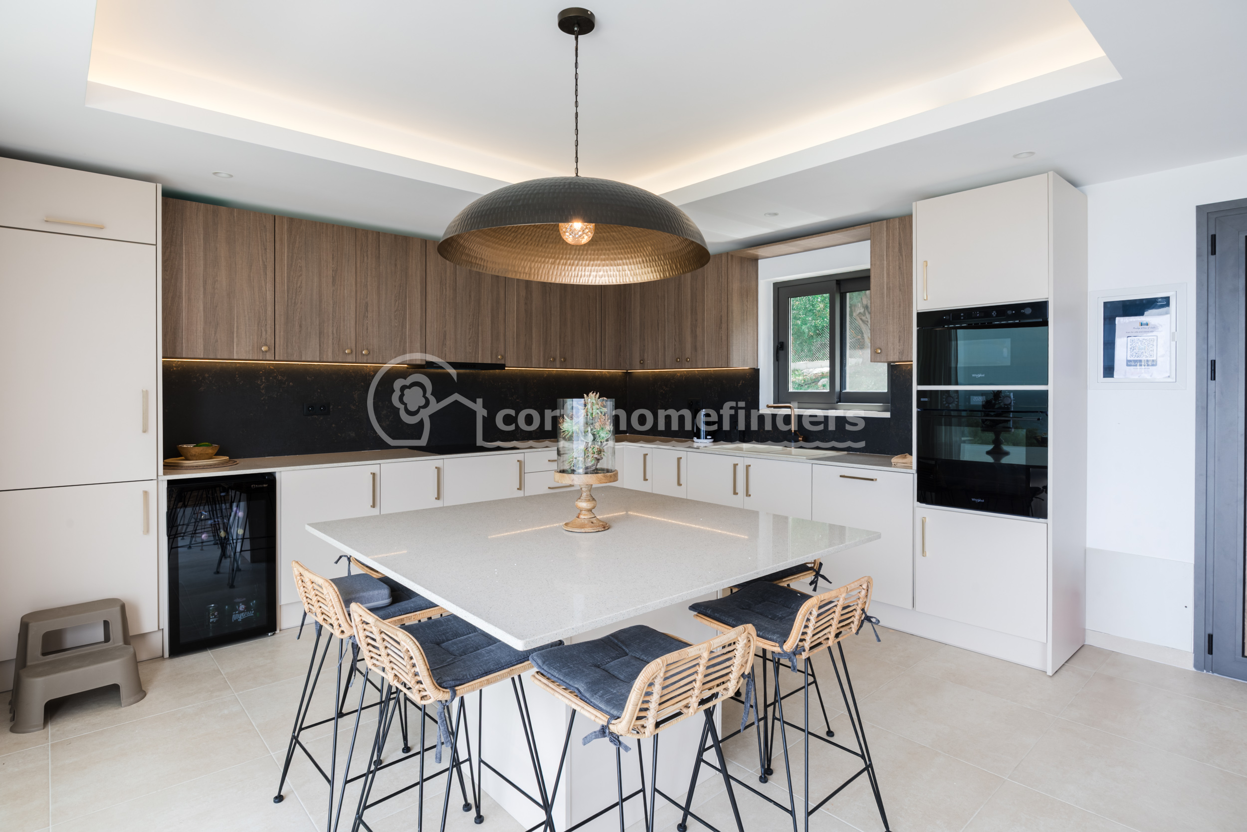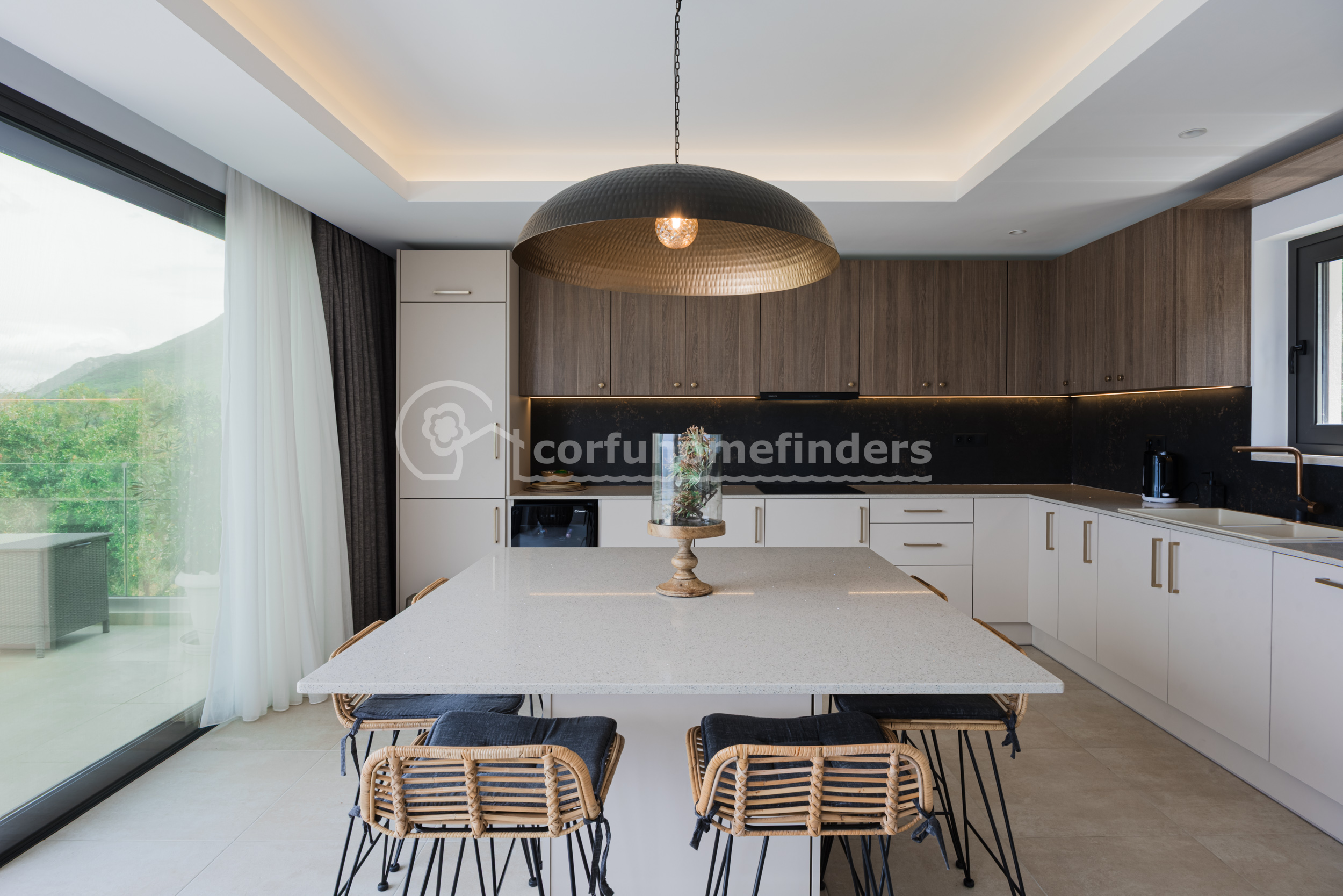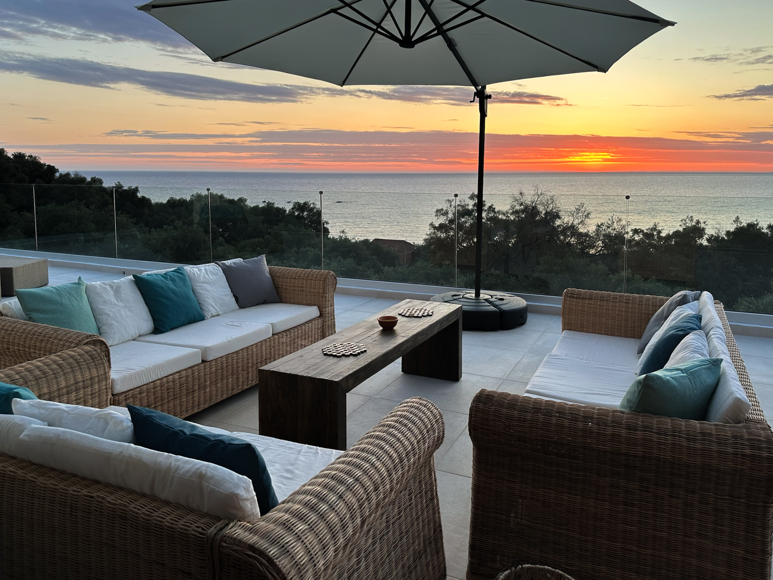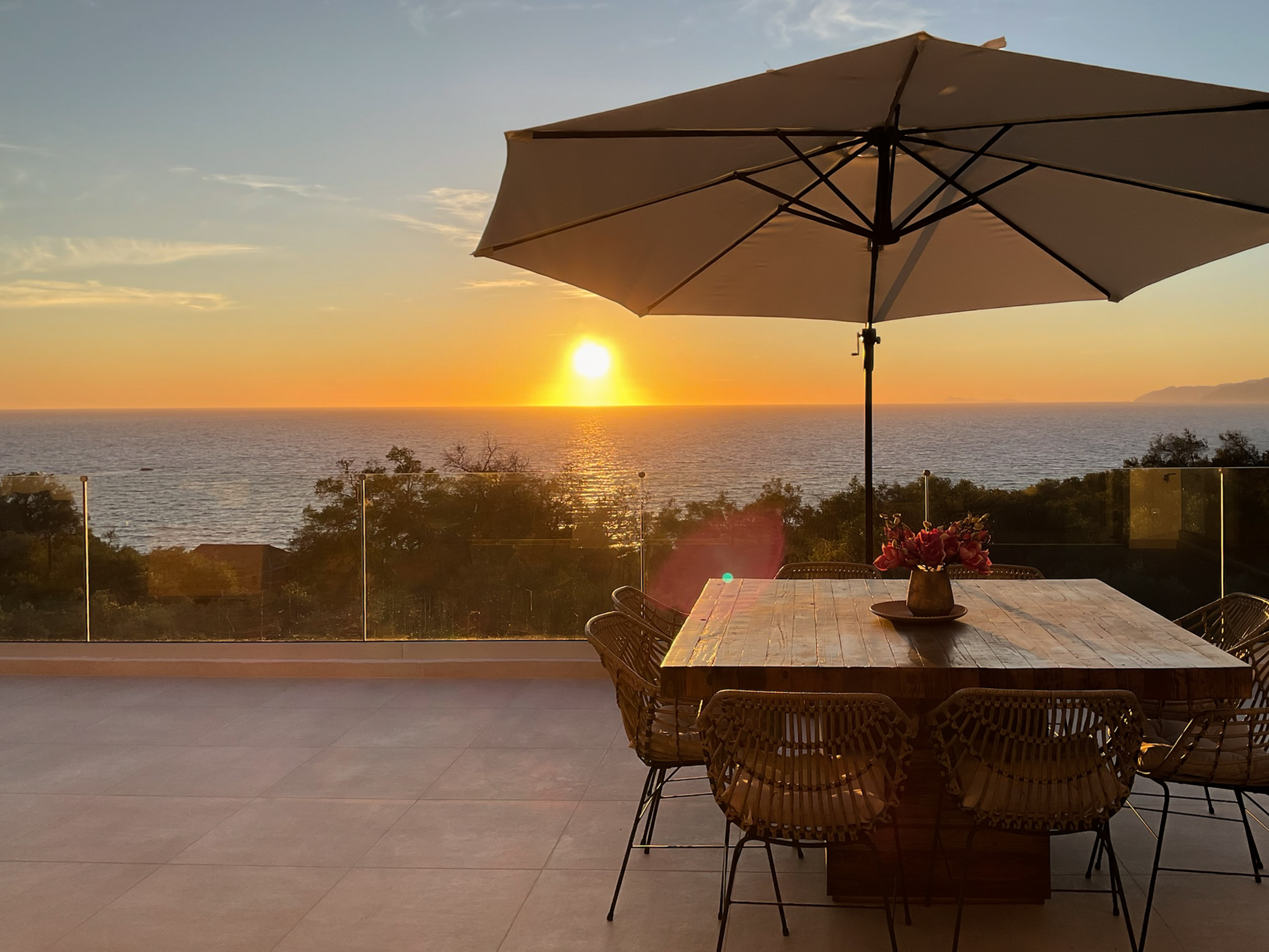 A sweeping driveway leads from the road up to the parking area at the back of the house, and some steps into the main entrance. Designed to take advantage of the wide sea views and stunning sunsets, the main living area is on the first floor. Here the enormous windows open onto a large terrace and enjoy all the spectacular views. At one end of the room is a modern kitchen, with an island in the centre and all modern fittings.