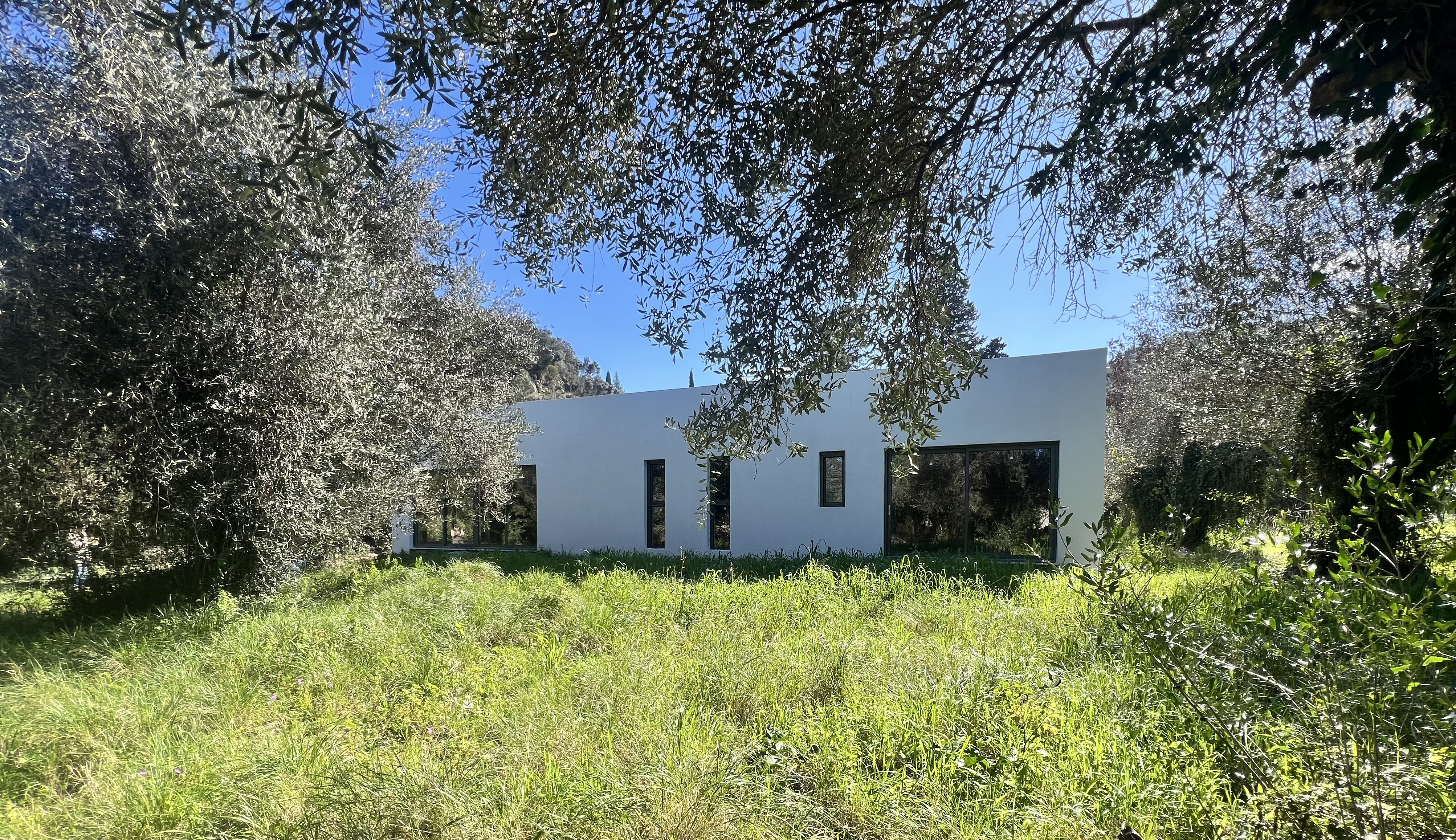Surrounded by windows, this modern style 151 m2 property, has a spacious open plan living room/kitchen/dining area with large sliding doors overlooking the pool area, garden and olive trees beyond.