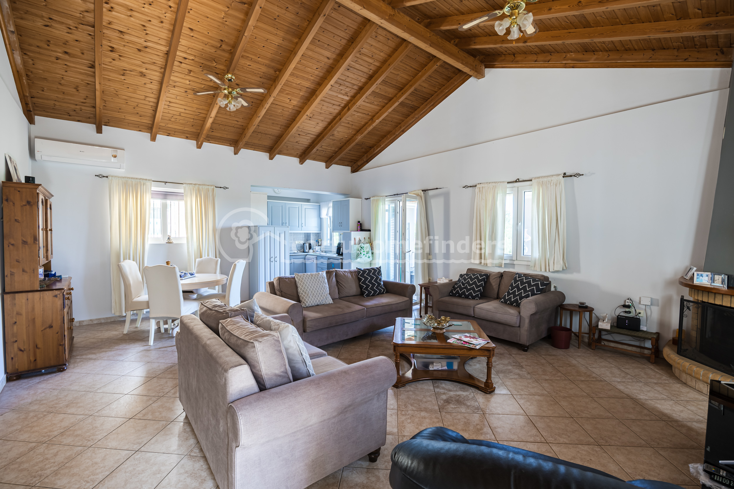 The front door opens into a large spacious living area, with high vaulted wooden ceilings and patio windows opening onto a balcony. At one side of the living area is a modern fitted kitchen and on the other side is an energy efficient woodburning fireplace. The floors are all tiled, and the room is very light and bright.