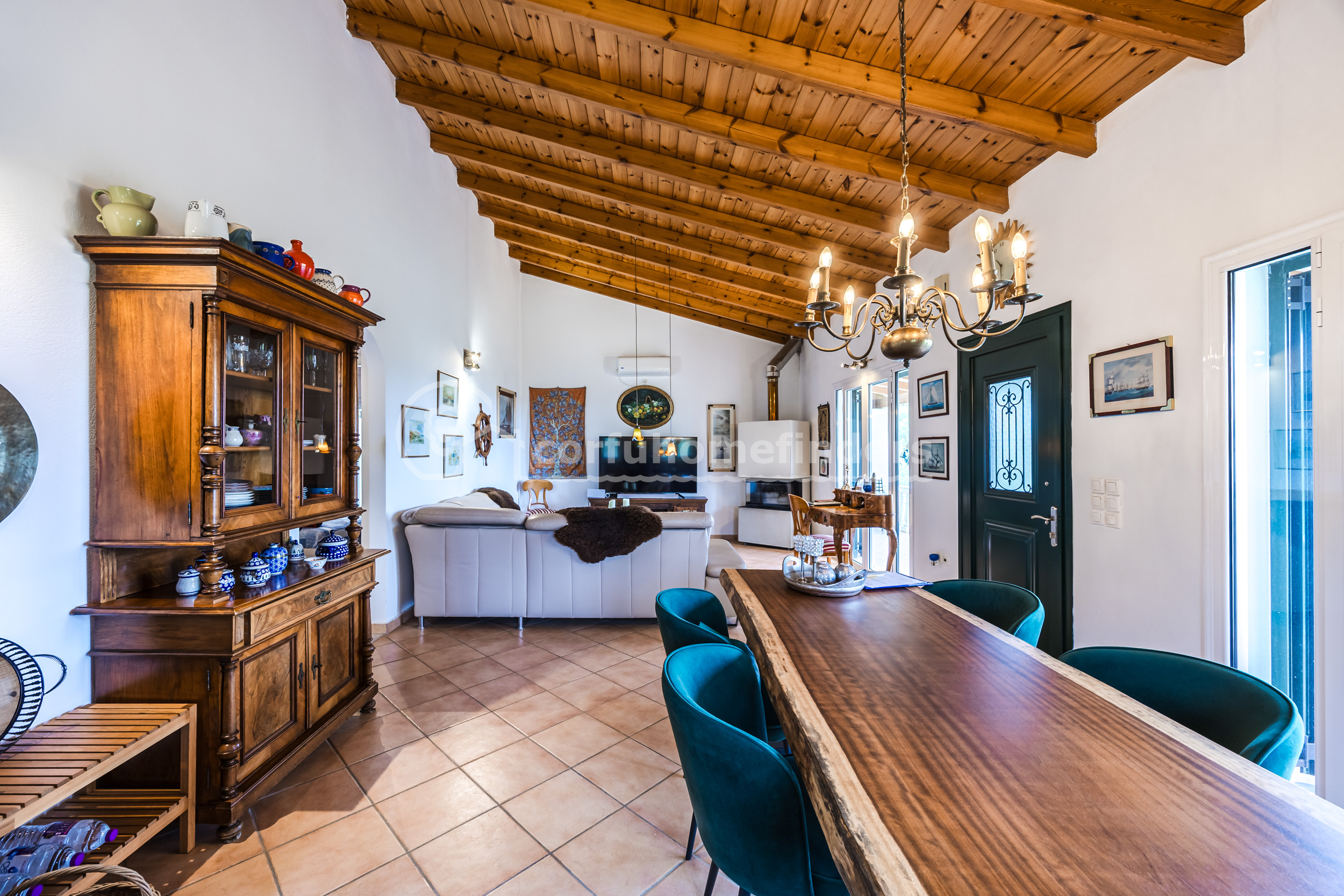 Steps lead up from the parking area to the covered balcony in front of the house overlooking the sea view. The front door leads from the balcony into an open plan living space with the kitchen/dining area on the left and the living room on the right. Large windows let in plenty of light and offer lovely views across the trees to the sea. There is an energy fireplace in the sitting room, ideal for the colder months.