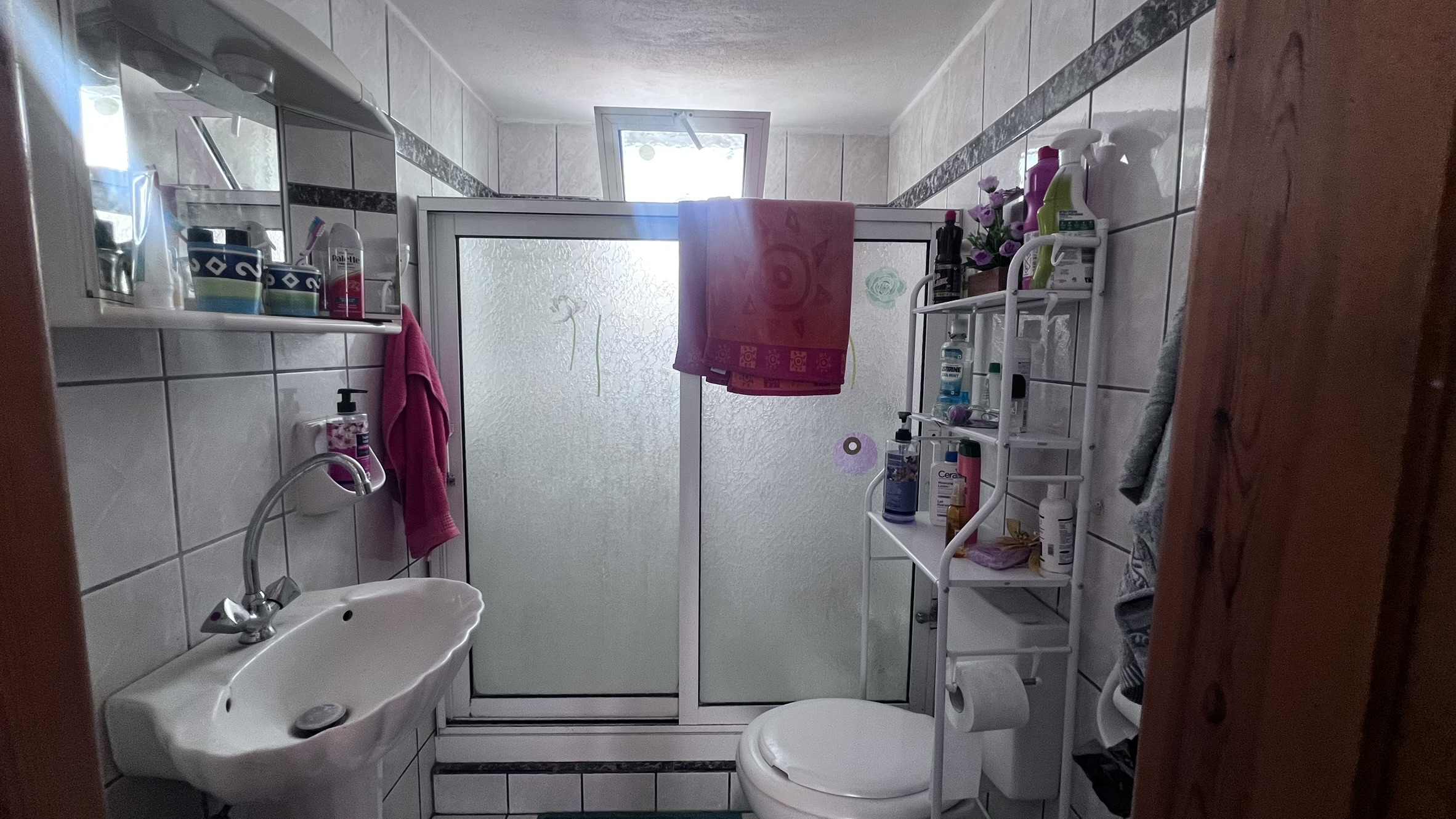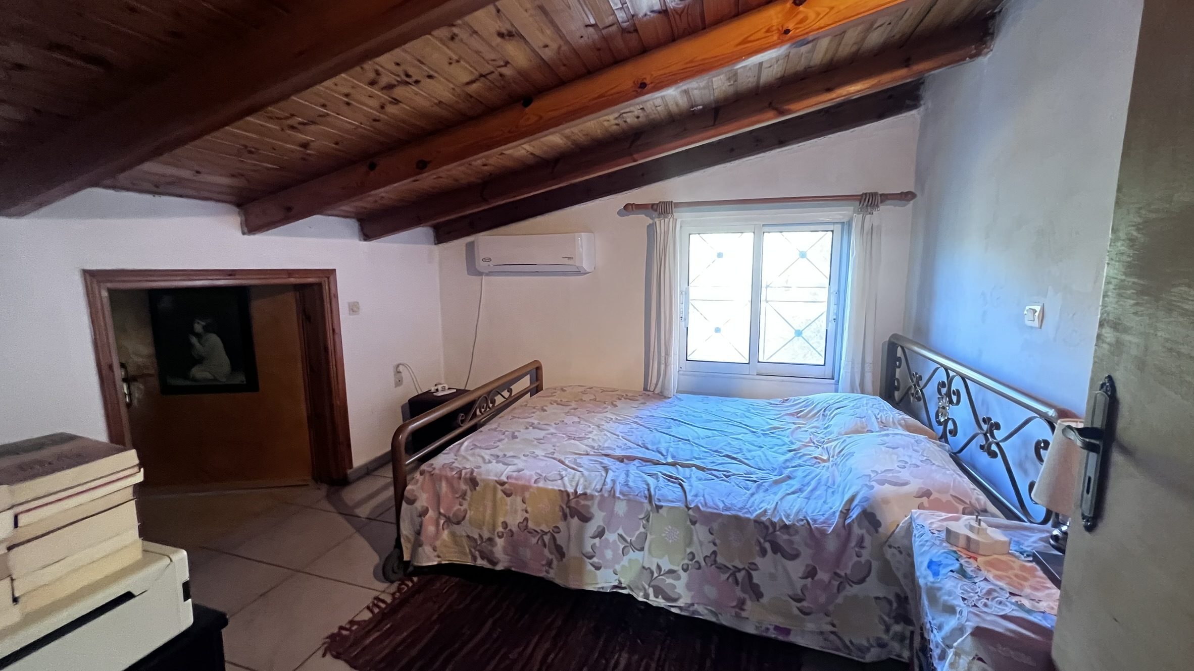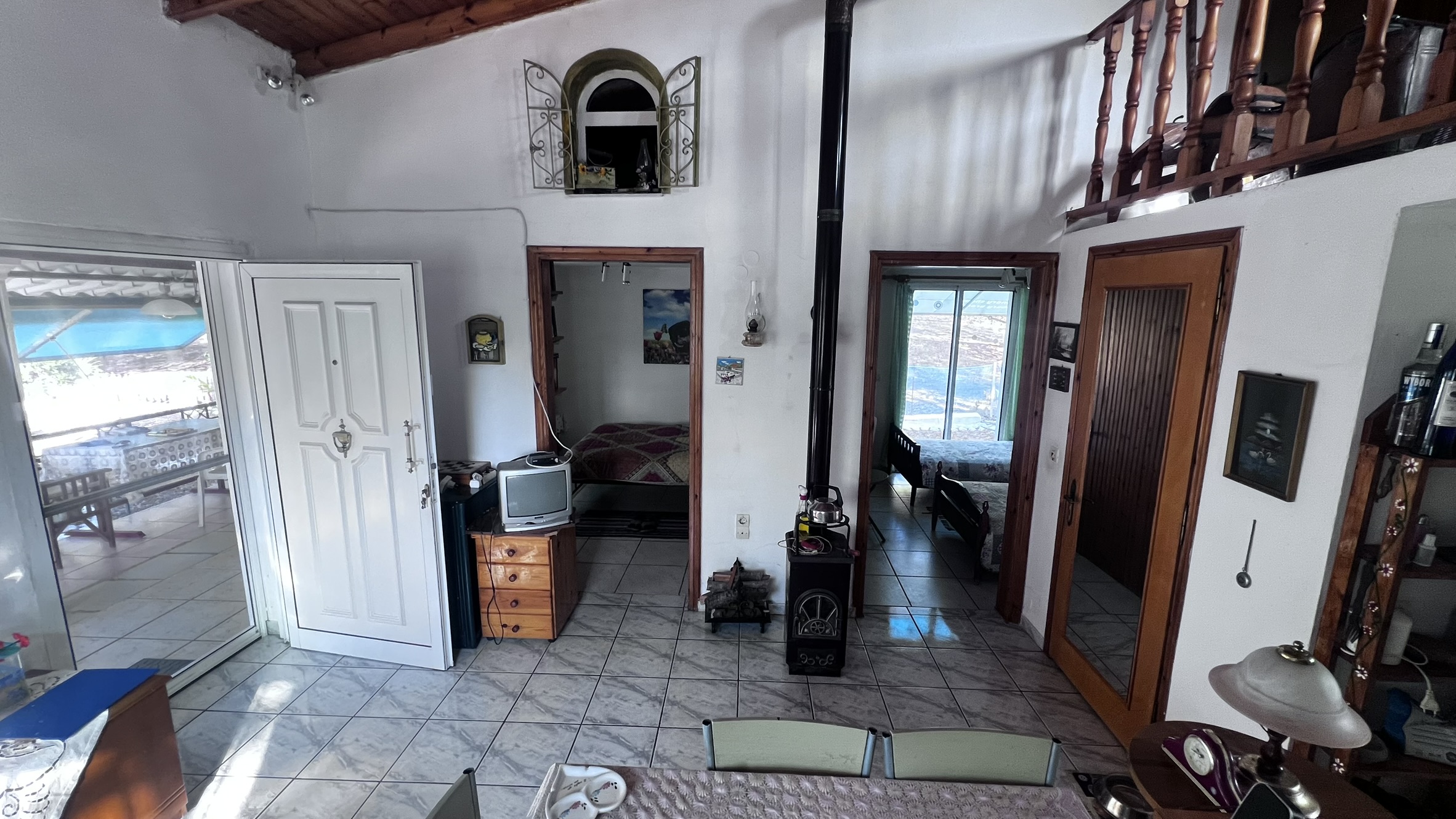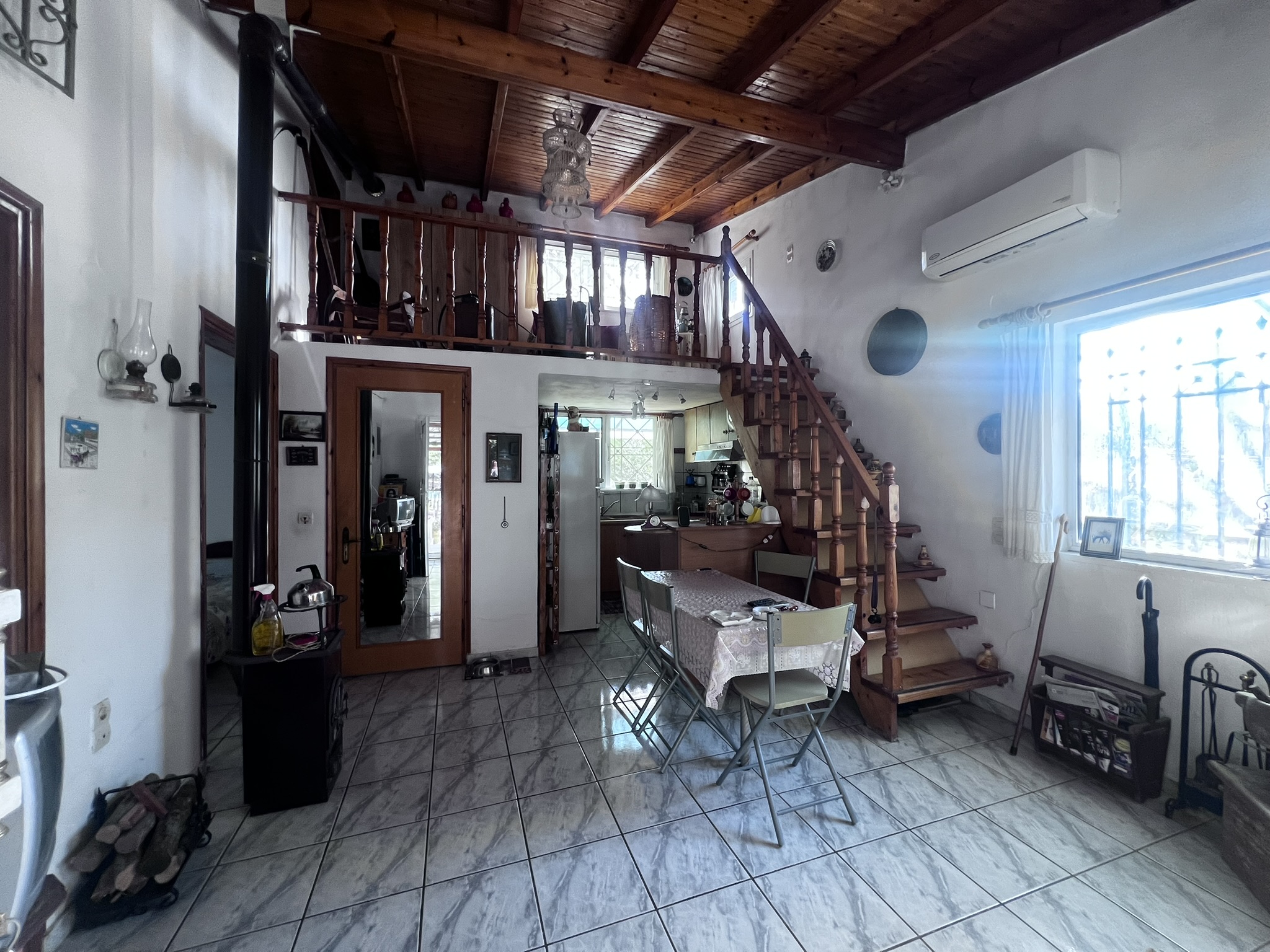 The layout of the house is designed to enter directly into a small dining area with a kitchen at the back and the bathroom next to it. The two main bedrooms being on the left-hand side and a staircase leading to a little maisonette with an additional spacious storage room.
