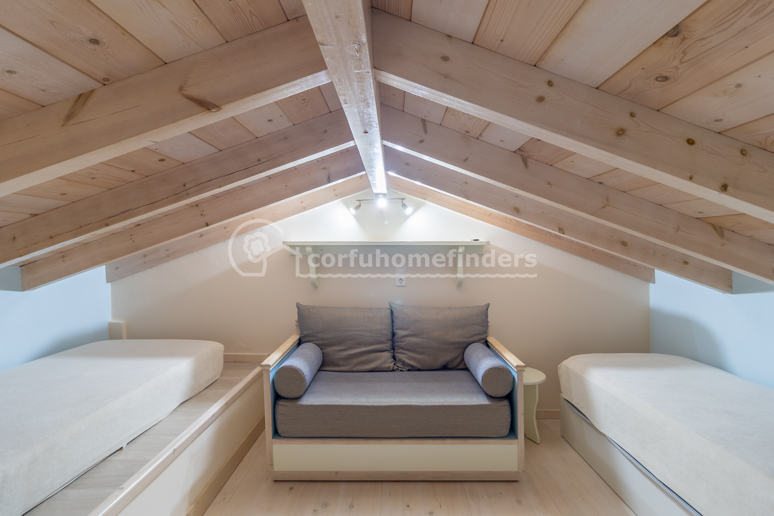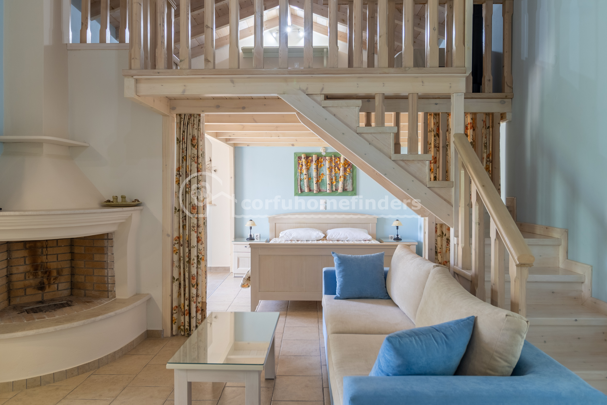 The sleeping area on the ground floor includes a double bed and a bathroom next. A set of wooden stairs leads up to a charming mezzanine space with two single beds.