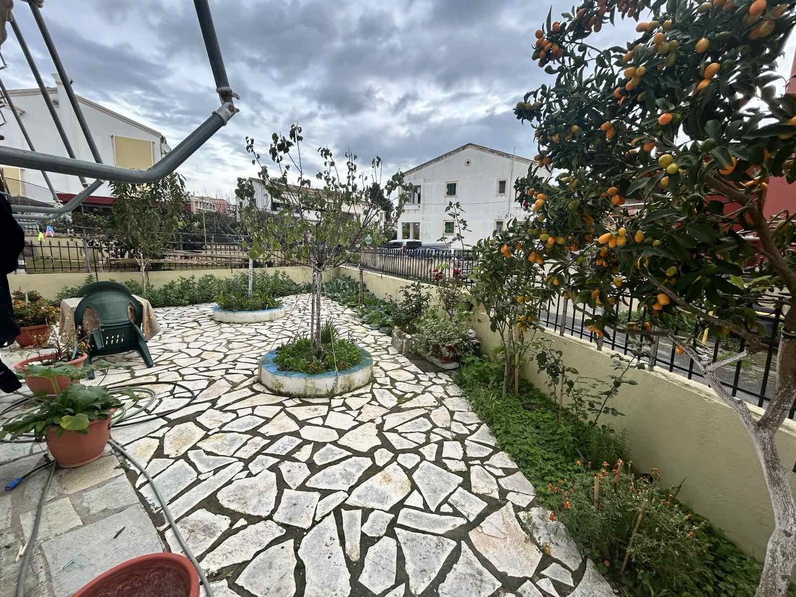 The gated courtyard surrounding the building includes a charming vegetable garden, adding a pleasant touch of greenery and a homely atmosphere.