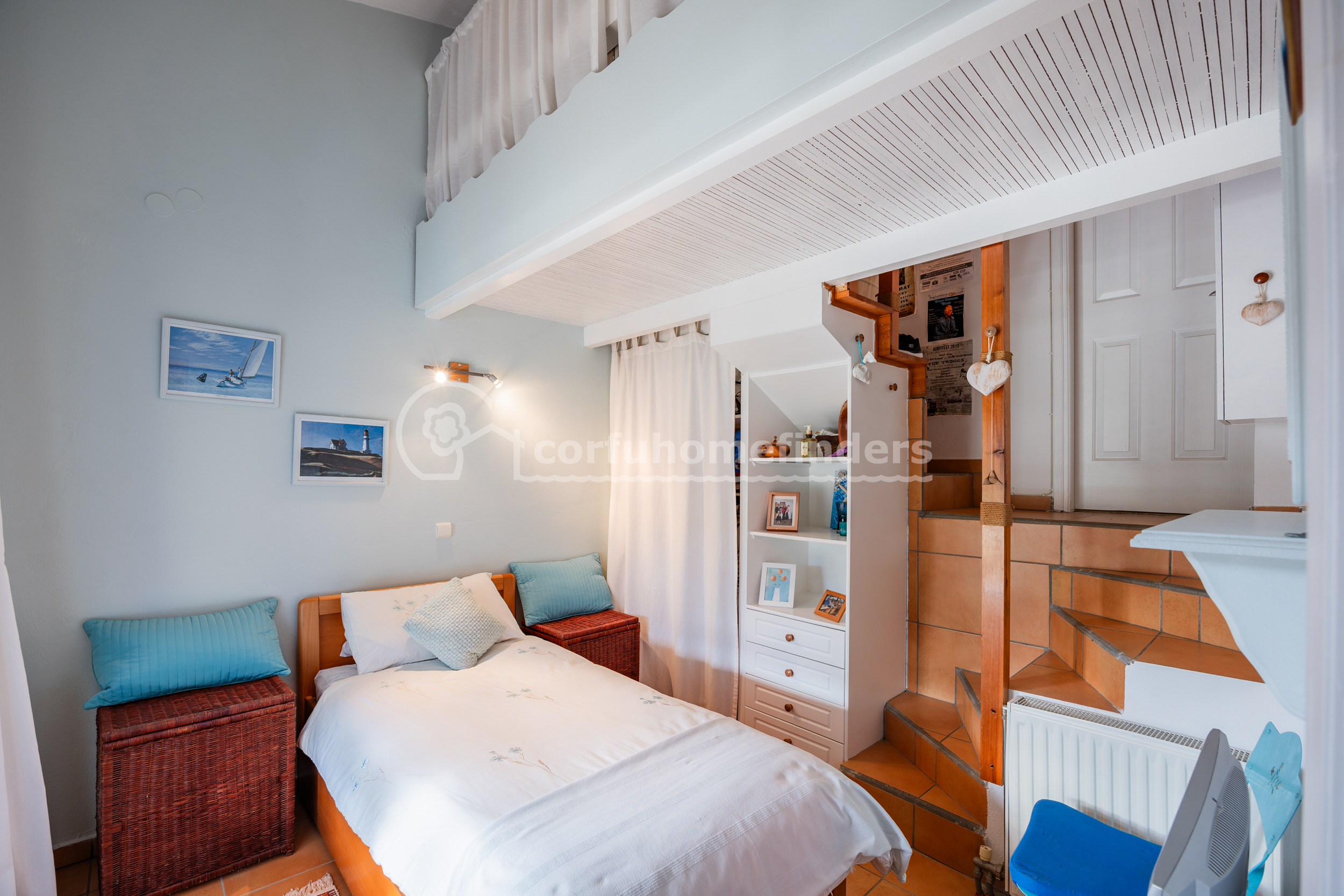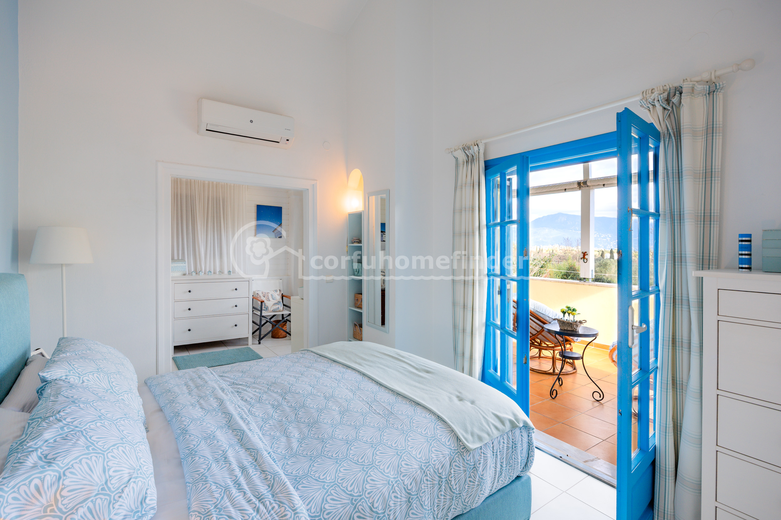 A few more steps lead up to the main bedroom suite - this is complete with an ensuite bathroom, dressing area, and balcony doors leading out to a very large covered terrace overlooking the property grounds and the view ahead.