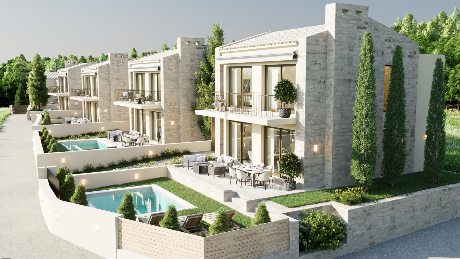 Located in the desirable and well-connected area of Poulades, the development offers convenient access to local amenities and is within easy reach of Gouvia marina and Corfu Town.